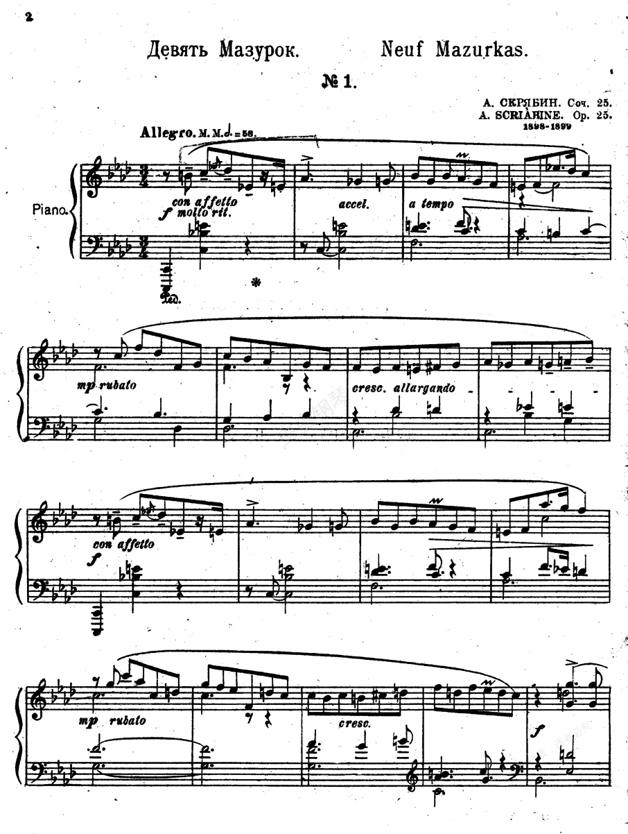 9首玛祖卡舞曲 Nine Op.25《九首玛祖卡舞曲》9 Op.25 ,作于1898-1899年。当时斯克里亚宾刚就任莫斯科音乐学院教授一年,创作上虽然仍以诗意为主,但已经开始对新式和声产生极大兴趣。他发现了属于自己的一种声音,这在他这个时期的作品,如前三首钢琴奏鸣曲、《十二首练习曲》Op.8、一系列前奏曲以及这部玛祖卡舞曲中有所体现。1. f小调,快板,由汹涌的开头带出紧张的气氛,间中可见一缕阳光。2. C大调,小快板,对他的《升f小调第三钢琴奏鸣曲》Op.23 的回忆。3. e小调,慢板,反映了作曲家沉思及即兴的一面。4. E大调,活泼地,在无忧无虑的音流中体现深刻的思想感情。5. 升c小调,激动地,宛如慷慨激昂的演讲。6. 升F大调,小快板,有着悲哀而感人的旋律,但在一片欢欣中结束。7. 升f小调,中板,跟上曲的伤感及迷人相比有过之无不及,更为焦虑的。8. B大调,小快板,对上曲伤感焦虑气氛的调解,但仍还未趋于平静。9. 降e小调,忧伤地,和声材料异常丰富。