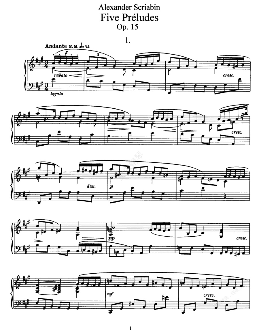 5首前奏曲 5 Op.15《五首前奏曲》Five Op.15 ,作于1895-1896年。1. A大调,3/4拍,行板。以其主题动机中的五连音为特色。2. 升f小调,3/4拍,活泼的。带有激动不安的性格,宛如一首双手流畅练习曲。3. E大调,6/8拍,甚快板。极为甜美动听,宛如一首双手琶音练习曲。4. E大调,3/4拍,小行板。旋律温柔如歌,宛如一首左手练习曲。5. 升c小调,6/8拍,自由的行板。相比较之下,这是稍欠个性的一首前奏曲。