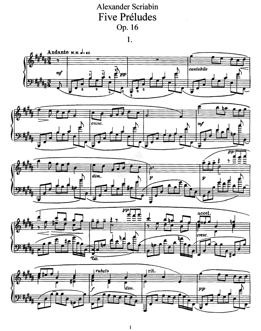 5首前奏曲 5 Op.16《五首前奏曲》Five Op.16 ,作于1894-1895年。这是比Op.15 更早完成的五首前奏曲,因发表较前者晚,故编号为Op.16 。1. B大调,3/4拍,行板。有着非常优美的旋律,左手分解和弦部分隐藏有副声部进行。2. 升g小调,2/4拍,快板。从孤寂走向激动,宛如一首和弦练习曲。3. 降G大调,4/4拍,如歌的行板。仿佛置身于皎洁的月色中。4. 降e小调,3/4拍,慢板。是最短小的一首前奏曲,仅有十二小节。曾被吉他大师塞戈维亚改编成吉他独奏曲。5. 升F大调,3/8拍,小快板。是非常精练迷人的一首小品。