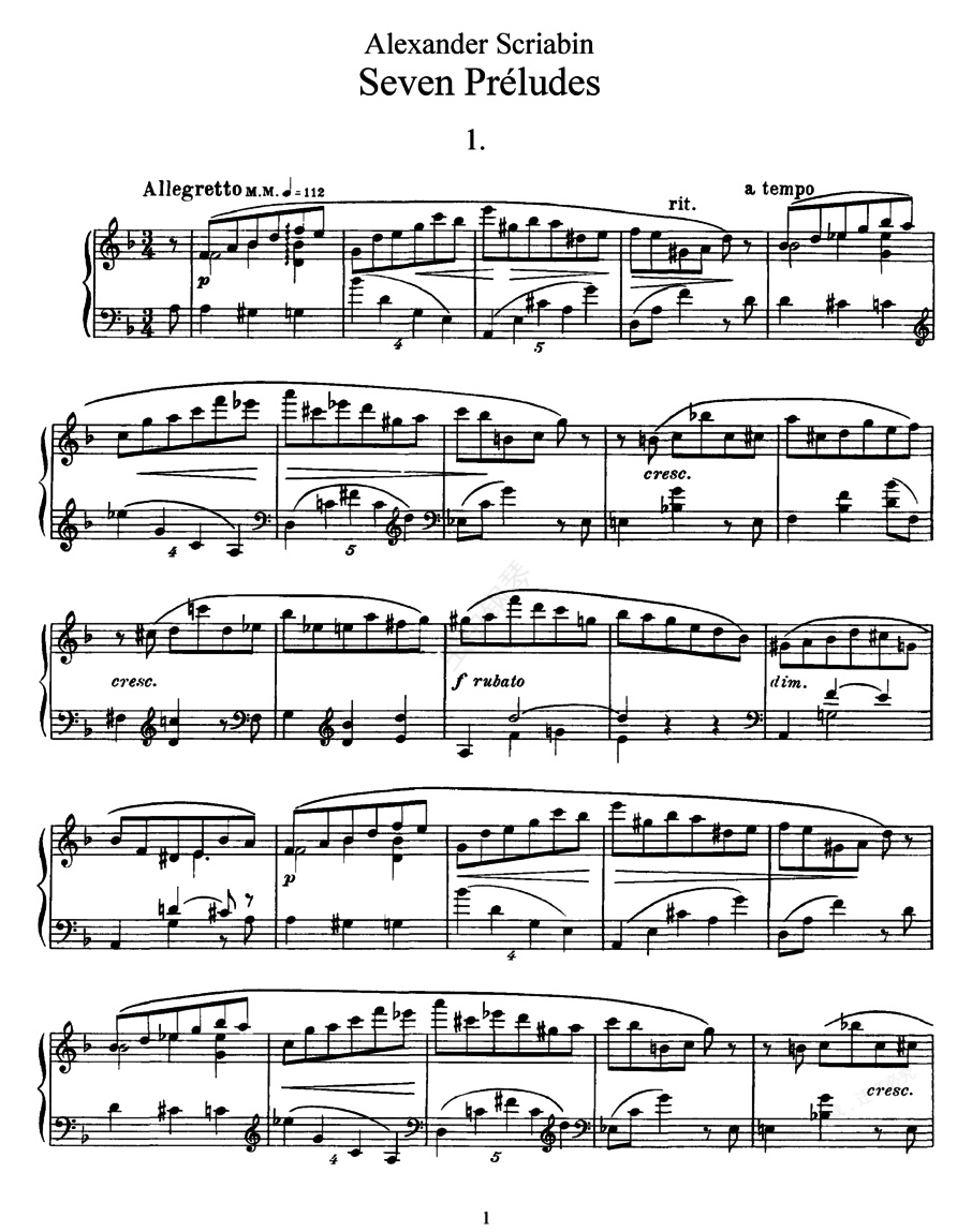 7首前奏曲 7 Op.17《七首前奏曲》Seven Op.17 ,作于1895-1896年。这组前奏曲在演奏技术上较之前发表过的前奏曲对演奏者提出了更高的要求。1. d小调,3/4拍,小快板。宛如一首右手流畅练习曲。2. 降E大调,2/4拍,急板。焦虑不安的情绪,宛如一首左手八度练习曲。3. 降D大调,3/4拍,行板。梦幻般甜美的夜曲风格。4. 降b小调,3/2拍,慢板。全曲笼罩在一片茫然之中。5. f小调,9/8拍,最急板。激动不安的情绪,宛如右手流畅和左手八度的练习曲。6. 降B大调,6/8拍,悲痛的行板。温柔而连贯的,是相对缺少个性的一首前奏曲。7. g小调,9/8拍,甚快板。以出现个性的四连音为特色。