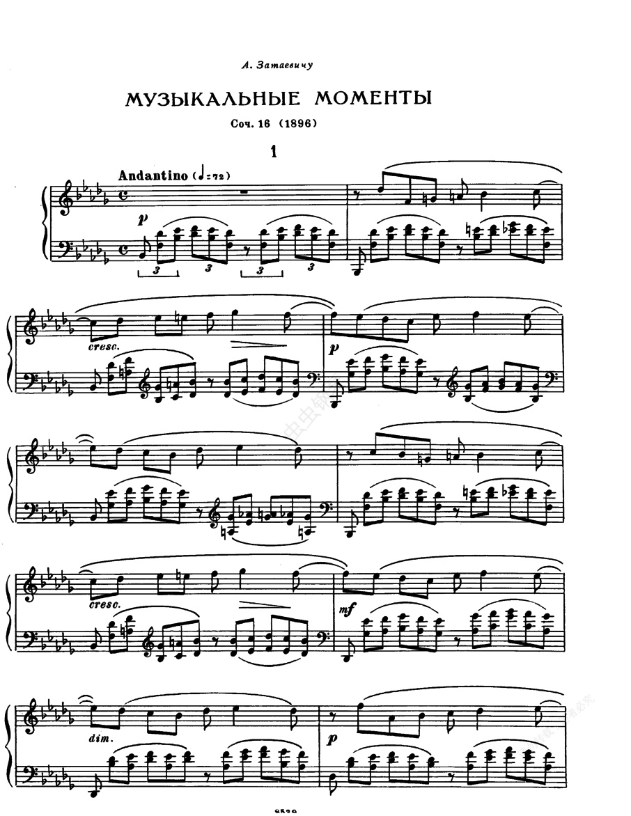 6首音乐瞬间 6 Op.16,一种钢琴抒情特性曲。一译“音乐瞬间”,或“乐兴之时”,或“瞬想曲”。“音乐瞬间”是舒伯特创造的与即兴曲类似的一种钢琴小品体裁。,为1828年春维也纳出版商M.莱德斯多尔夫用法语所起的曲名。拉赫玛尼诺夫的《音乐瞬间》 Op.16 ,作于1896年,共由六首小曲组成。由于它们的严肃性和复杂性,这些音乐性和高难度融为一体的作品似乎更象他随后创作的《音画练习曲》,要求演奏者有全面而生动的演奏技巧。第一首,降b小调,4/4拍,小行板。这是一部较长的作品。这首可以分为四个乐段的乐曲中,最后一段是第一段的再现。乐曲以一个以左手八分音符三连音伴奏的优美而热忱的旋律展开。这一部分音乐在近乎独立的完整性里发展至一个高潮,又很快转入一段在装饰音衬托下进入高潮的华彩乐段。紧接着的是一段近乎寂静、让人窒息的段落,在精细而密集的音符中浮现出第一乐段主旋律的轮廓。整部作品拥有极其动人的美感。第二首,降e小调,2/4拍,快板。这首曲子可以被看作是一首练习曲。右手切分的八度音构成的旋律,辅以双手快速的三连音伴奏,展现出鲜明的拉氏风格。乐曲转入降E大调后形成了动人的高潮,这一部分充分准备和发展,折射出辉煌壮丽的效果,接着则逐步进入一个宁静的结尾。第三首,b小调,4/4拍,如歌的行板。以庄严而带有贵族气息的进行曲展开,并反复了一次。第一遍是单纯的陈述,第二遍则以精致的低音伴奏下形成断奏色彩的八度音奏出。拉赫玛尼诺夫在整个作品中充分发挥了九和弦的作用。 第四首,e小调,4/4拍,急板。这是另外一首练习曲性质的乐曲。作品一开始就以快速的十六分音符六连音伴奏,衬托出逐渐上行的旋律而展开,第二段落保留了左手快速伴奏的手法,右手出现快速的下行音符群。再现第一主题时,音乐进入了一个巨大的高潮,在整个钢琴上构造出了让人难忘的音乐形象,然后终结于一个极其强烈而突然的结束。第五首,降D大调,4/4拍,持续的行板。这个作品比拉氏的另外一部题为“船歌”的作品(Op.10)更象是一首船歌。这是一首温柔而甜美的间奏曲,也是六首作品里唯一的一首让人精神舒缓松弛的作品。第六首,C大调,3/4拍,庄严的。这首作品灵感似乎来自肖邦的《练习曲》Op.25-12。在这里拉赫玛尼诺夫的音乐形象更为静谧,但那深沉而巨大的音乐流动感是一样的,急促而强有力的旋律在由双手奏出的快速分解和弦的伴奏下突现出来。深沉的乐曲中段和结尾部分的高潮拥有如此宏大的音响,以至于超越以往所有为钢琴而创作的乐曲。