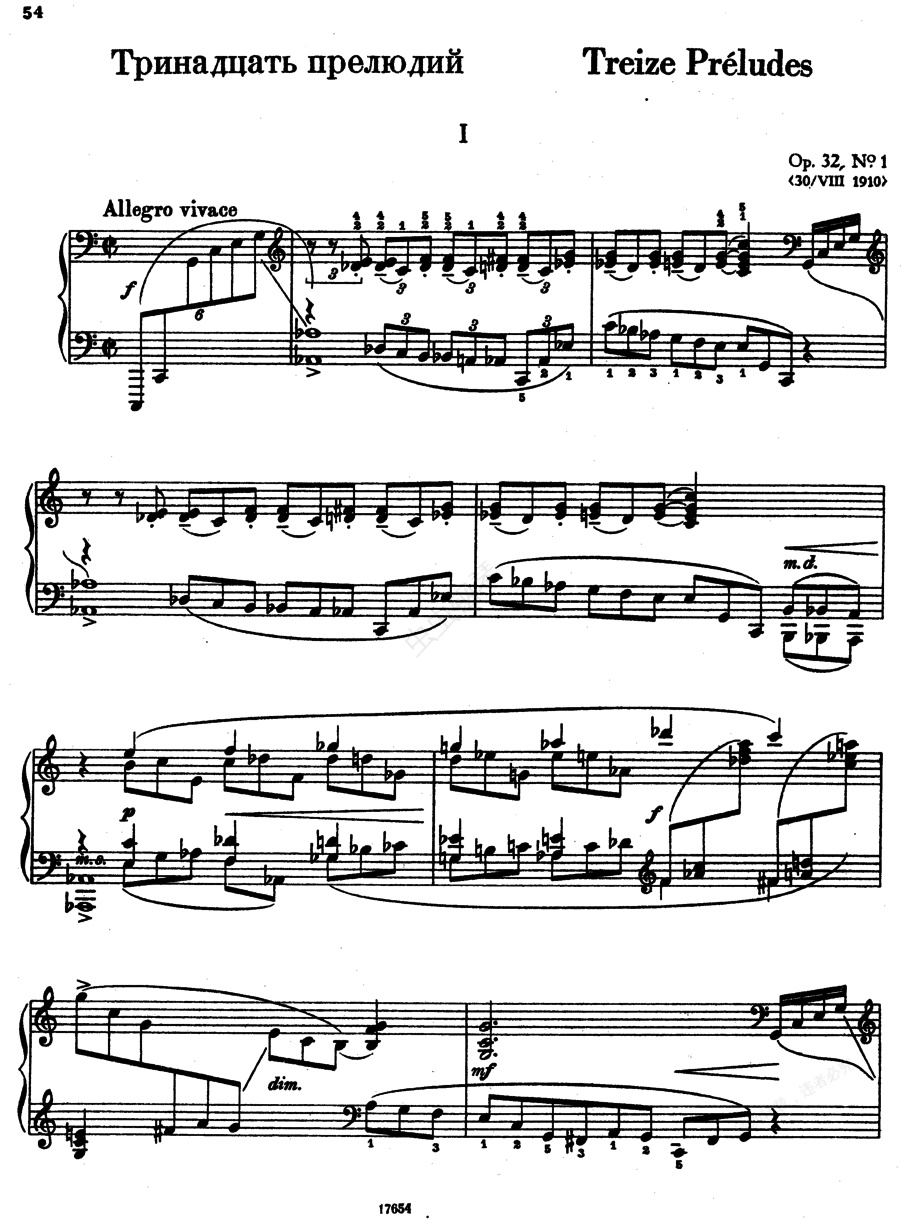 13首前奏曲 13 Op.32《十三首前奏曲》13 Op.32 ,作于1910年,13首分别为:1.活泼的快板,C大调,以机械性三连音符为中心,旋律大多以半音阶进行,和弦却采用全音阶。2.小快板,降b小调,淡淡的主题,以形形色色的速度变化制造不同的音色。3.活泼的快板,E大调,描绘民众集会的场景。4.灿烂的快板,e小调,三段体。第一段先以八度奏鼓号曲乐念,加入快速三连音符乐念后两者追逐。中间部为广板,古俄罗斯叙事曲的旋律。第三段重现第一段,突进为尽可能的急板后,以轻快终止。5.中板,G大调,在分散和弦上流动细腻的音型。6.热情的快板,f小调,先呈现热情的主题,然后进入华丽风格。7.中板,F大调,三段体。第一段以进行曲的乐念始,中间部为轻快地。8.轻快地,a小调,有导入部,然后轻松活泼地进行。9.中庸的快板,A大调。先以低音八度奏出旋律,高音以修饰形态进行,中间把旋律移至高音域,结尾变成轻快。10.广板,b小调,三段体。第一段浸透浪漫气质,稍为更快的小结尾后转入中间部,有互为对照和弦效果。第三段再现第一段后有长大的华彩。11.小快板,B大调,有玛祖卡舞曲风格。12.快板,升g小调。第一部分右手弹分散和弦,中音域有流畅的旋律。中间部左手奏分散和弦,右手奏新的旋律,练习曲风格。13.极缓板,降D大调,三段体。第一段庄严的主题在厚重的和弦中进行,中间中为A大调,转慢,右手为抒情旋律,用快板提示主题。变为轻快后转升C小调,回到第一段主题而结束。