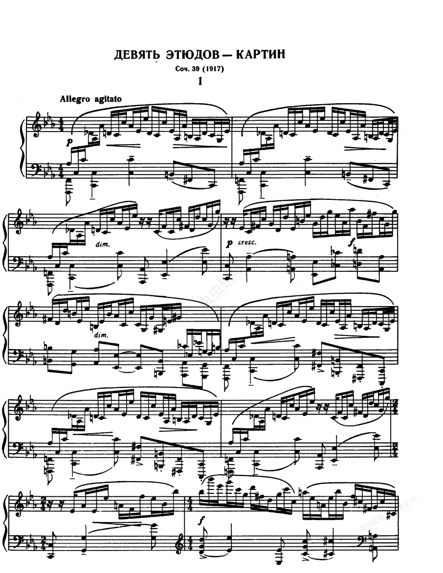 音画练习曲 Op.39《音画练习曲》 Op.39 ,作于1916-1917年,共有九首作品组成,其中第六首由原Op.33第四首改写而成。这九首作品分别是:1.激动的快板,c小调,右手急速的分解和弦,左手刻划切分音节奏。2.甚慢板,a小调,在低音旋律与右手旋律错开半拍进行中嵌入交叉节奏的三连音,拉赫玛尼诺夫表示,这是表现海洋与海鸥的故事。3.精确的快板,升f小调,开头音型在执拗的重复中变成流动的音型。4.甚快板,b小调,一种进行曲型的谐谑曲,拉赫玛尼诺夫说,这是描写市集场景。5.热情地,降e小调,以三连音符刻划的和弦伴奏下,奏自然小调的旋律。6.快板,a小调,托卡塔风格,拉赫玛尼诺夫说,这是表现小红帽与野狼的故事。7.广板,c小调,拉赫玛尼诺夫说这是送葬的队伍,其中有哭声与钟声。8.中庸的快板,d小调,以一个短小的动机统一全曲,中间出现稍慢速度后,出现新的旋律。9.中庸的快板,进行曲速度,D大调,称为“东方进行曲”。