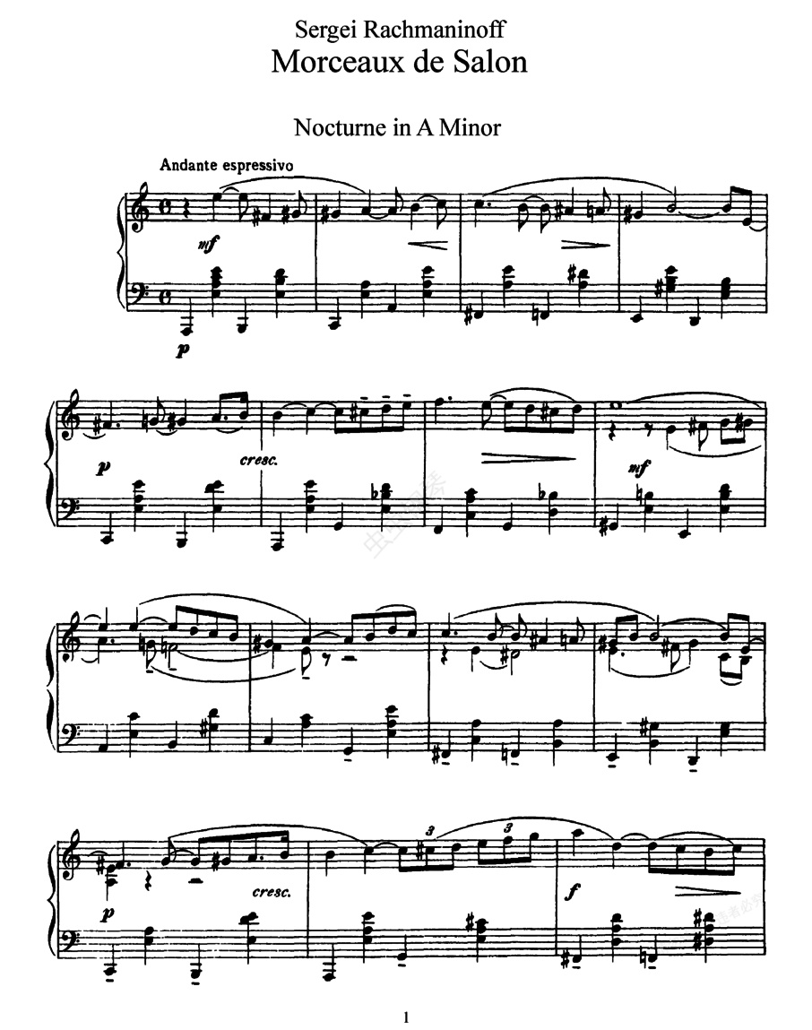 沙龙小品集 de Salon Op.10《沙龙小品集》 de Salon Op.10 ,作于1894年,也就是创作《幻想小品集》Op.3 后两年,柴科夫斯基去世后一年。共有七首钢琴小曲组成:1. a小调夜曲 in a Minor ,4/4拍,有表情的行板。2. A大调圆舞曲 Waltz in A Major ,3/4拍,甚快板。3. g小调船歌 in g Minor ,3/4拍,中板。4. e小调旋律 in e Minor ,3/8拍,小快板。5. G大调幽默曲 in G Major ,2/4拍,活泼的快板。本曲于1940年修订。6. f小调浪漫曲 in f Minor ,4/4拍,悲痛的行板。7. 降D大调玛祖卡 in Major ,3/4拍,玛祖卡速度。