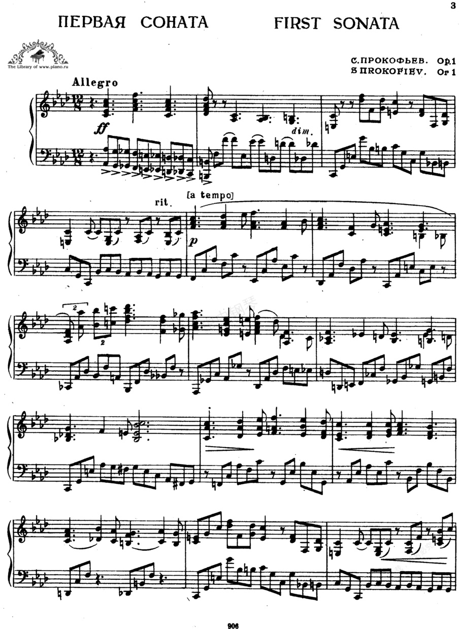 f小调第一钢琴奏鸣曲 Piano No.1 in f Minor Op.1《f小调第一钢琴奏鸣曲》Piano No.1 in f Minor Op.1 ,作于1907-1909年,1911年出版,体现作曲家的同乡与密友瓦西里·莫洛列夫。该作品属于作曲家青年时期的作品,是作曲家根据学生时代创作的六首钢琴奏鸣曲中的第二首加工而成的,修改时删掉了后面两个乐章,成为单一乐章的奏鸣曲。全曲采用统一的快板速度,节拍标记为12/8拍,实际上是4/4拍,而以三连音的节奏贯穿全曲。在四小节的引子之后主部主题进入,这个在1911年创作的第一钢琴协奏曲中就具有的性格,显示出作曲家青年时代生气勃勃的力量。连接部之后,副部主题按照传统的规范,调性安排在平行大调降A大调上,音调以高音与中音声部反向的半音进行为特征。在展开部结束处的音调得到展开,直到高潮段落时,才出现主部主题向上推进的音调。紫黯这里,由于低音声部的持续低音与上方的和弦产生的矛盾,和声上突破了后期浪漫派的管用手法,带有某种复合调性的效果。整个再现部的写法也比较复合传统的规范,五小节的尾声后,在有力的强奏和弦中结束全曲。总的看来,这是一首严格按照古典奏鸣曲式规范写成的奏鸣曲。由于是学生时代的作品,全曲尚未充分表现出作曲家成熟时期的风格特点,从中倒可以看出斯克里亚宾、拉赫玛尼诺夫、梅特涅等俄罗斯后期浪漫派作曲家的影响。由此可见,虽然普罗科菲耶夫以现代作曲家身份在登上世界乐坛时,是以强烈反对当时乐坛上流行的后期浪漫派风格而引人瞩目的,但作曲家在这之前对于后期浪漫派作曲家的作品曾进行了精深的研究,并熟练地掌握了这一风格写法的基本特点。