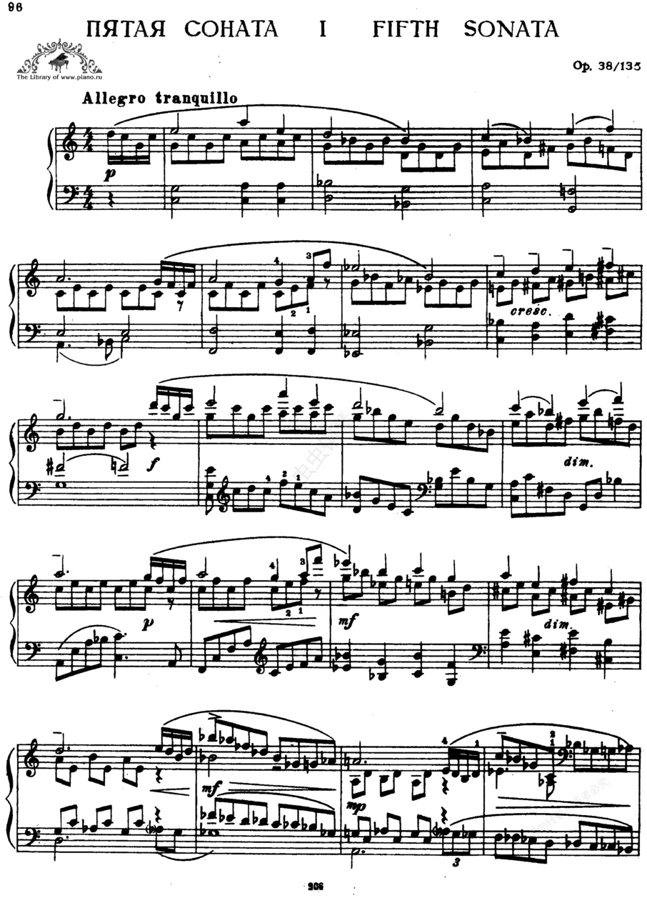 降B大调第五钢琴奏鸣曲 Op.38(修订后编号为Op.135)在钢琴音乐从创作上,普罗科菲耶夫是在德彪西之后最引人注目、成就最大的以为作曲大师。他不但继承了19世纪的钢琴音乐传统,还在钢琴这种乐器上加上了野性而有魄力的表现,缔造了一个新的钢琴音乐时代。这首《降B大调第五钢琴奏鸣曲》Piano No.5 in Major Op.38 是普罗科菲耶夫流亡国外时期创作的四首钢琴奏鸣曲中的最后一首,1923年作于巴黎。他回国后,于1952年~1953年对此曲作了较大的修改,第一乐章展开部及尾声几乎完全改写,第三乐章也作了较大修改。为此,普罗科菲耶夫将原作品38改为新编号 Op.135 ,现在演奏的就是经修改后的新版,于1955年出版。第一乐章,快板,沉静地,C大调,4/4拍,奏鸣曲式。明朗而流畅的主部主题似乎比较接近于古典音乐语汇,是歌唱性的,没有激烈的变化。副部主题却接连出现出人意料的进行,表现出作者所特有的幽默情趣。展开部以主部主题开始,之后是副部主题以强大有力的形态出现,左手是单纯的三连音的反复。第二乐章,小行板,降G大调,3/8拍,三部曲式。这个乐章有强烈的表现主意倾向,是这首乐曲中最美妙动人的乐章。平稳而典雅的小步舞曲式的节奏,配以新颖的现代风格的旋律,造成了奇妙的效果。一开始有装饰音的主音断奏和弦单调地奏出,主部主题以不安定的形态在它上面展开。中段仍保持同样的节奏,最后再现主部主题。第三乐章,稍快板,C大调,4/4拍,回旋曲式。这个乐章体现出作者喜欢在钢琴上奏出打击乐效果的倾向。故意强调的尖锐、干涩的不协和音响与呆板的节奏,在主要主题最后一次再现时达到高峰,特别是尾声部分更令人感受到一种“机械”动力性展开的因素。一开始乐章的回旋曲主题轻快地奏出。第一插部主题是回旋曲主题的延伸。第二插部主题的力度逐渐增强而转为强烈的表情。随后回旋曲主题被分解,作自由处理,与第一插部主题混合在一起进行,最后,乐曲在持续的托卡塔风的曲趣中结束。
