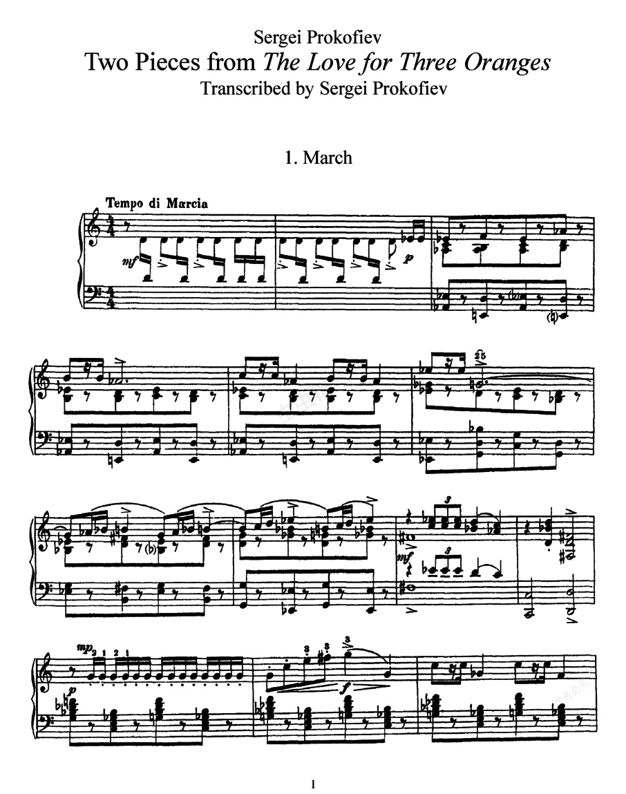 进行曲和谐谑曲 March & - 选自童话歌剧《三个桔子的爱情》1919年,普罗科菲耶夫在美国创作了新古典主义的四幕童话歌剧《三个桔子的爱情》The Love for the 3 Op.33 。1921年12月30日,由芝加哥歌剧协会在芝加哥剧院,由作者亲自指挥,作首次公演。这是根据《图兰多》的原作者格齐的童话剧创作的,叙述一个王子受到巫女的诅咒,飘洋过海寻找三个桔子,最后找到时,桔子里有个姑娘,与王子成婚。故事情节是虚构的,它将童话、笑话、讽刺巧妙地结合起来,成为二十世纪最成功的童话歌剧之一。全剧始终充满着幽默感和戏剧性,且带有很强的动作感,听起来十分有趣。这部歌剧的旋律性不强,多为朗诵式的音调,加上用俄语演唱,在世界上很少演出,录音更不多见。但它十分重视乐曲的表现,剧中性格鲜明、轮廓突出的间奏乐段比比皆是。剧中第二幕第一场的《进行曲》March旋律清新明快,节奏矫健有力,那一连串清脆的小鼓敲击声和嘹亮的小号声,一下子就带出了进行曲壮丽的色彩与活泼的生气,且充满着现代气息,成为演出、录音的热门曲目。作者另据歌剧中的部分选段组成的《三个桔子的爱情》组曲也很受欢迎。普罗科菲耶夫将其中的《进行曲》March 和《谐谑曲》 改写成钢琴独奏。1. 进行曲 March ,4/4拍,进行曲速度。2. 谐谑曲 ,6/8拍,精神抖擞的快板。