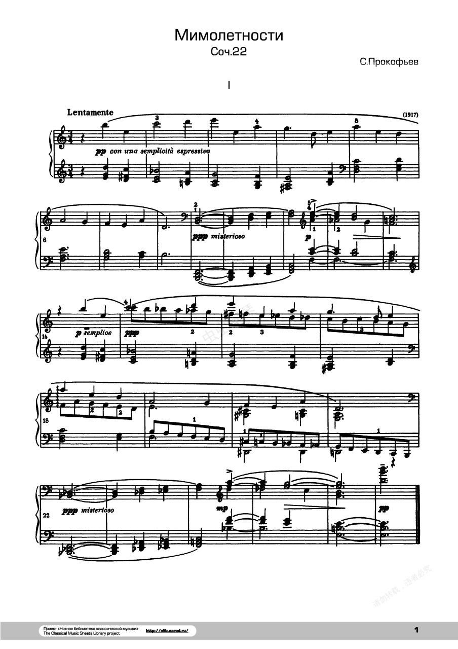 瞬间幻想 Op.年春,普罗科菲耶夫完成钢琴套曲《瞬间幻想》 Op.22 ,其中前面的十一首写于1915~1916年间,这一年又增加九首,总共有二十首作品。这是普罗科菲耶夫的特种“日记”,它以大胆的试验与简明的表现著称。套曲的标题--“瞬间幻想”--是从巴尔蒙特的诗借来的:      每一个瞬间我都在看着花花世界,      全是些变化无常的五光十色的玩意儿。二十首《幻想瞬间》从情绪表达与形象塑造看都非常多彩。作者从对比出发安排着它们的次序,让抒情的篇页与舞蹈-谐谑的或是戏剧性的篇页轮流交替。其中有些显得放荡不羁,动力性较大,似乎在描写敌对力量之间的搏斗。比如,标明“粗野”的第14首,神经质的兴奋状态突然为光明的向往所代替;带尖锐中音的第4首则建立在极具的音响对比与不同音区的呼应上。阿萨菲耶夫发现后者与最后两首《讽刺曲》有共同之处:在这里“热血沸腾的笑谑”为冷漠的“麻木气氛”所代替。有些好像是歌剧或者舞剧场面的梗概,或者是表现古怪对比的场面,或者是感应戏剧性冲突的紧张气氛的场面。具有奇异幻想性的与色彩描写性的《瞬间幻想》,同出奇制胜的巧妙和声技艺是完全适应的。作者在这里就和声、节奏和钢琴织体等方面做了各种可能的试验。精美的第7首,模仿竖琴,织体与和声方面的发明超过旋律思维是显而易见的。慢圆舞曲节奏的第12首或者带暗淡的神秘色彩的第2首又是这样的文雅。故意玩弄某些手法有时会把作者引向颓唐、缺乏生气,有时甚至连主题也不那么自然,比如第13和15首。《瞬间幻想》中代谐谑性的或者温柔抒情的几首比较好。第3、5、6、10、11几首是普罗科菲耶夫幽默中最光辉与最新颖的范例,它们充满年轻人的朝气,没有一点迷惘的阴影或者嘲弄的鬼脸。这些小钢琴谐谑曲,有时同那些原是多核儿童畅游歌曲典型的节奏以外地结合在一起,却又用了非常大胆的和声连接。快乐淘气的第5首建立在大三和弦的自由交替上。五部轻盈的第10首,充满最滑稽可笑的蹦跳和喊叫、蹬脚和拍手:在你面前仿佛可以看到一个会表演的孩子准备做各种嬉戏的调皮相。在不长的小曲里,把尖锐幽默的与最温柔抒情的两种对比强烈的形象突然交替,是普罗科菲耶夫的一个特点。比如,第3首,摇曳的摇篮曲节奏突然为类似《大管诙谐曲》的疯狂舞曲所代替;与此相反,第11首,在喜剧性的玩笑与丑角的喧嚣声中突然出现俄罗斯式的动人歌曲的旋律。做为套曲点缀的是几首纯粹抒情的小曲,它们象俄罗斯故事一样饱含着感情敦厚与心灵纯朴的美。从第1、8、16、17、20首我们可以看到普罗科菲耶夫的《老祖母的故事》以及此后许多童话抒情形象的起源。其中有些格外纯洁,鲜明的自然调试的旋律,象《浪漫曲》Op.27那样,与美妙的和声基础(没有解决的七和弦一个接一个)结合得很有效果,比如第1首,听上去很像一个孩子在做天真甜蜜的梦。这些抒情小品往往采用透明的“C大调”,例如第8首与第14首的中部、第6首的大部分。建立在白键上的音乐,普罗科菲耶夫早在作品27的浪漫曲中就用过。第16、17首,还有最后第20首的一部分,具有静谧沉思的引向、徐徐摇摆的节奏与明朗忧郁的情绪。作者把安静透明的抒情小品作为套曲的一头一尾并非偶然。这些对《斯基夫组曲》的作者说来日罕见到此安抚形象,在整部套曲中骑着决定性的作用。《瞬间幻想》中优秀之作是有权进入俄罗斯钢琴古典作品之列的。卡拉蒂根曾从这部套曲看到青年普罗科菲耶夫转向深刻揭示心灵活动这一方面是正确的;“在这些被作者称之为《瞬间幻想》的20首小品里,除听到从前那种自然主义音响外,已经可以听到新东西了,--卡拉蒂根写道--从那儿到这儿,在充满热情的掌声与失败的哀鸣,无谓的忙碌与杂乱无章之间,你会突然稳到某种温柔的、甜蜜的气味。普罗科菲耶夫与温柔……你还不相信吗?这部美妙的组曲一旦问世,你自己一顶会深信无疑的”。相隔六年之后,马雅柯夫斯基谈起《瞬间幻想》,还要中肯,还要热忱。他同样为普罗科菲耶夫转向表现多种多样的抒情而高兴:“在《瞬间幻想》中,人们可以清楚地感到作者心灵固有的深刻程度和丰富程度;感到作曲家已经度过掐断头猛跑的阶段,开始停下来环顾四面八方,并且发现这里不仅有惊人的旋风,而且还有深深打开心灵的安静时刻,这才是经常运动中最本质的东西……”。马雅柯夫斯基坚决支持这种深刻人性的、抒情的因素,而这种因素在这之前只不过在普罗科菲耶夫的某些作品中昙花一现,现在在《瞬间幻想》的音乐里却显示出多么有力啊!马雅柯夫斯基认为,这种情况使他“看中普罗科菲耶夫,就像看中我们年轻的音乐史上不久前走过一辈合法的天才继承人一样”。