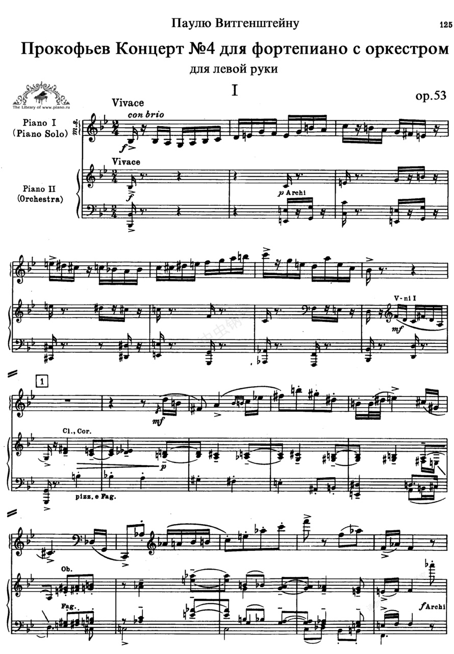 第四钢琴协奏曲 Piano No.4 Op.53 - 为左手而作《第四钢琴协奏曲“为左手而作”》Piano No.4 “For the Left Hand” Op.53 ,作于1931年,因为在一次大战中失去右手的著名钢琴家维特根斯坦(Paul)而作,故又称为“左手钢琴协奏曲”。此曲作成之时,维特根斯坦称“我看不懂其中的任何一个音符”而拒绝接受,故直至维特根斯坦去世后3年,此作完成25年后,1956年才由普罗科菲耶夫改订,于9月6日由在二次大战中失去右手的拉普( Rapf, 1917~)主奏首演。此曲普罗科菲耶夫自己的说明为:“第一乐章是着重于手指技巧的快速乐章,第二乐章是以平静和庄严展开的行板,第三乐章是快板奏鸣曲,第四乐章则咀嚼第一乐章。”此部作品共四个乐章:第一乐章,活泼地,托卡塔形态,自由的三段体。在弦乐、大鼓降B音强奏支持下,主奏钢琴奏主要主题,在十六分音符音阶化进行后,单簧管、低音管、圆号等下行半音阶性和弦进行伴奏下,钢琴奏轻松的旋律。在返回十六分音符音阶性旋律与分解和弦快速的动势,前后有单簧管悠闲的旋律,第一小提琴奏滑稽的音型。第一小提琴在弦乐伴奏下奏新乐念,主奏钢琴断奏出现细碎音。第二段钢琴奏金属般的尖锐音响,以降A音为中心作机械化重复,低音乐器作半音阶化伴奏。主奏钢琴模仿半音阶进行,在低音域展开八度强奏。第三段再现第一段,最后铜管和主奏钢琴以小三度和弦有力地结束。第二乐章,抒情的行板。有小提琴平静的旋律开始,单簧管继承,主奏钢琴奏三连音符乐句后奏主要主题,弦乐短小应答后,中提琴、低音提琴表现这个主题,钢琴奏分解和弦。钢琴奏引子旋律,乐队发展主要主题,至高潮后,钢琴以和弦方式奏三连音符乐句,引子开头旋律经各种乐器强调后轻轻消失。第三乐章,中板,中庸的快板,奏鸣曲式。在乐队强奏后,小号奏第一主题前半乐句,弦乐回应后,主奏钢琴呈示第一主题后半乐句,重复后进入中庸的快板。在弦乐刻划的节奏上,主奏钢琴呈示第二主题,第一主题前半部分出现于长笛与小号。第二主题再由第一小提琴奏出,第一主题前半部再由主奏钢琴奏出,第一主题后半部经主奏钢琴和木管发展后,经极快的快速音群,主奏钢琴再奏新乐念,各种乐器继承后,低音管再现第一主题前半部。第一主题后半部、第二主题以主奏钢琴为中心,由各种乐器再现,经快速音群而结尾。第四乐章,快板,以第一乐章十六分音符快速流动的主题为主要素材来发展,全章一直处于活跃的动态中,最后干净利落地结束整部协奏曲。