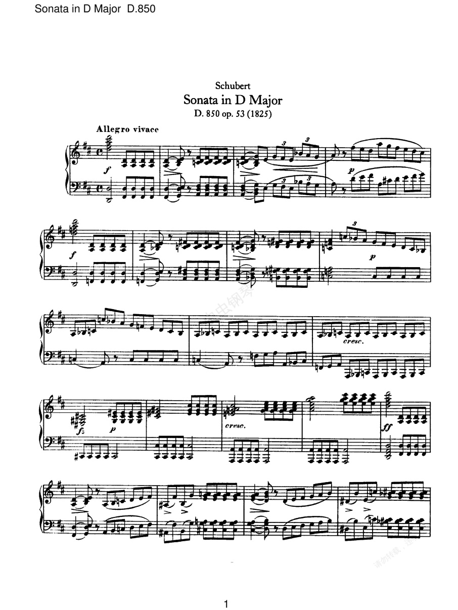 D大调第十七钢琴奏鸣曲 Piano No.17 in D Major Op.53 D.850《D大调第十七钢琴奏鸣曲“勇敢”》Piano No.17 in D Major "" D.850 ,作于1825年,是舒伯特二十八岁时的作品,曲风充实,自由不拘泥形式。舒曼称此曲为“勇敢的D大调”,它也确实是一首朝气蓬勃的作品。舒伯特将这首奏鸣曲题献给卡尔·玛利亚·封·勃克列(Karl Maria von)。他是波希米亚裔的奥地利钢琴家,比舒伯特小四岁,不仅擅长钢琴演奏,也擅长小提琴演奏。为此他成为当时颇有名气的音乐家。与舒伯特有亲密的交情,经常积极地演奏舒伯特的作品。共有四个乐章:第一乐章,活泼的快板,D大调,4/4拍。乐曲一开始就是强有力出现的第一主题,为乐曲掀起序幕。两小节的和弦连续演奏后,是对比强烈的两小节三连音,在巧妙的转调的烘托下,引出轻柔的第二主题。展开部以第一主题素材为主进行发展,在发展的中间突强地奋起,就是舒曼称为“勇敢的”高潮之一。第二主题在D大调简单的重现后,进入稍快的结束部,最后表情丰富地结束。第二乐章,速度加快,A大调,3/4拍,三部曲式。舒曼对此乐章说:“具备了舒伯特独特的风格,动人又充满热情”。此乐章还令人有大方又悠然自得之感。第一部分主题的节奏具有独特的强音,旋律流畅,热情动人。第二部分主题在下属调D大调。之后两部分以A大调为轴心,略加修饰变形而再现。结束部分出现了第一部分的素材,舒畅的结束乐章。第三乐章,谐谑曲,活泼的快板,D大调,3/4拍。这个乐章生动活泼,内容充实。谐谑曲主题的表情是丰富的。中部转为G大调,其中表现了舒伯特的和声及器乐风格。乐曲进入结束部时,渐渐减弱,乐章在平静的气氛中结束。第四乐章,回旋曲,中庸的快板,D大调,4/4拍。回旋曲主题以哼唱似的潇洒性格,轻快洒脱地唱出。流畅的第一插部主题移为A大调,不稳定的第二插部主题在G大调中穿插有g小调。结构为结束部。