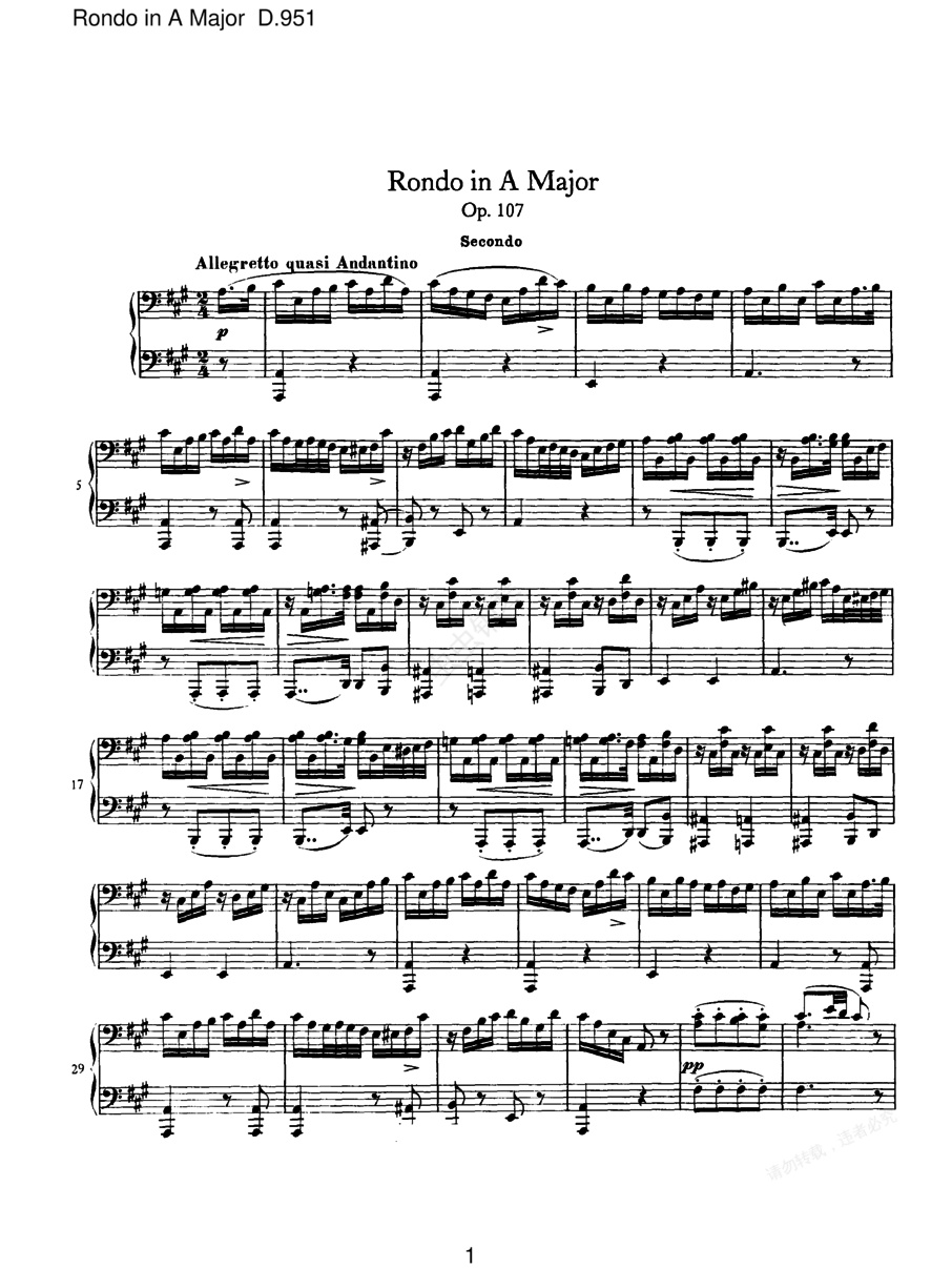 A大调回旋曲 Grand in A Major Op.107 - 四手联弹舒伯特直到晚年,都不断以“进行曲”、“幻想曲”、“序曲”,以及“奏鸣曲”的形式写联弹曲。爱因斯坦说:“并非是那种以两架钢琴竞争式的协奏式联弹,而是用一架钢琴四手联弹,写这种象征友情的联弹曲,十足的说明了舒伯特其人。”《A大调回旋曲》Grand Rondo in A Major D.951 ,是这类四手联弹作品的最后一首。乐曲采用颇似小行板的稍快板,A大调,2/4拍。这首作品的主题充满着徐缓的乡土气息很浓的曲调。这个主题在第二钢琴有规律的伴奏音型上,附加装饰音型而进展。随后,在第二钢琴出现使用三连音的可爱的经过主题。不过这只是导向真正的第一插部主题的E大调经过句。第二钢琴再次担任伴奏,第一插部主题由第一钢琴发展下去。主要主题再现后,第二插部主题出现,它并没有独立的主题,而是将已有的主题进行发展。音乐巾帼一段发展后,第三次出现主要主题。之后是第二钢琴弹奏旋律的第一插部主题,最后,主要主题第四次出现。