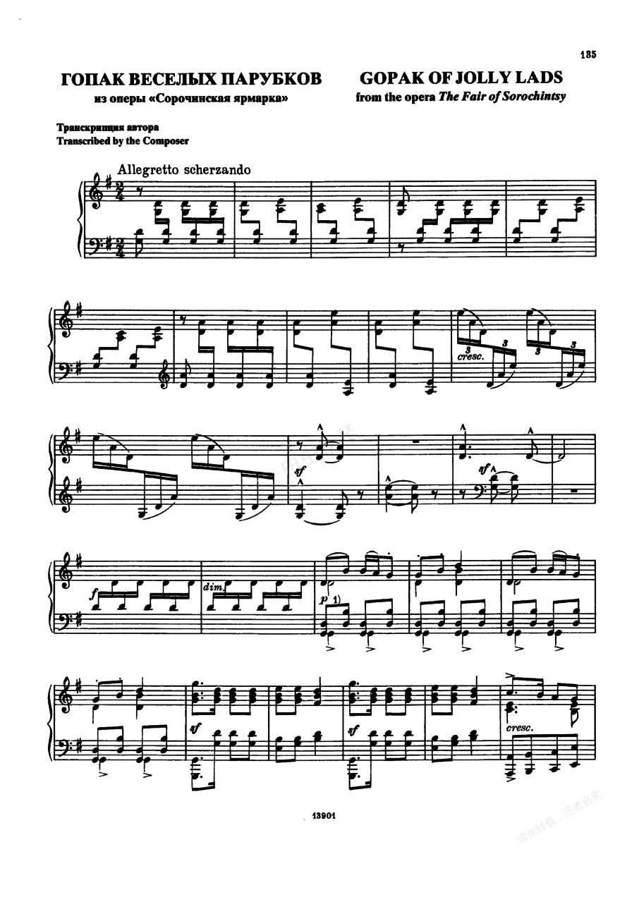 戈帕克舞曲 Gopak - 选自歌剧《索罗钦集市》戈帕克舞曲 Hopak(Gopak)是一种乌克兰民间舞蹈,又译“霍帕克舞曲”,舞者身着鲜艳的民族服装,竞相即兴表演各种舞步,如跳跃、蹲式踢腿和旋转等,气氛异常热烈。这首《戈帕克舞曲》Hopak ,原为穆索尔斯基作于1847-1880年间的一部未完成歌剧《索罗钦集市》 Fair 中的选曲,于1880年曾由作曲家本人改编成钢琴独奏曲。随后于1923年11月13日,由拉赫玛尼诺夫重新改编并首演后,成为广为流传的钢琴名作之一。作品选用G大调,2/4拍,谐谑的小快板。其生动活泼的音乐很容易令人联想到俄罗斯舞者那轻快的步伐、伏特加酒,以及热闹的节日场景。另外于1926年,拉氏还将其改编成小提琴与钢琴演奏曲。
