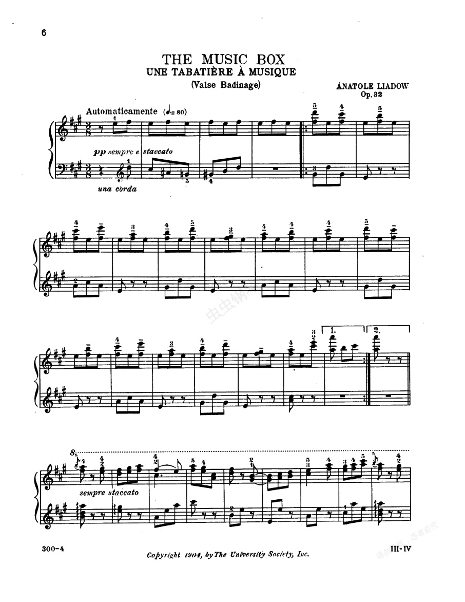 八音盒 The Music Box Op.32钢琴小品《八音盒》The Music Box Op.32 ,副标题为“滑稽的圆舞曲”Valse ,作于1893年。原作的乐谱上注明“给儿子米海尔”,可见仅是普通的儿童小曲,但此曲却充分表现了里亚多夫那独特的作曲风格与技巧。里亚多夫并不是一位钢琴演奏家,但是当时的人们都公认他的钢琴演奏具有相当高的水平。在他的作品中他一直避免卖弄钢琴技巧,其乐曲表现可以说是丝毫不含杂质的。乐曲以用钢琴表现音乐盒感觉的特殊手法贯穿,表情记号也特别采用“自动装置式的”。主部主题为A大调、3/8拍。平行三度奏法、明亮的高音和轻巧诙谐的旋律,维妙维肖地模仿了“八音盒”那清脆悦耳的音响。乐曲的中间部分轻盈欢快,富有歌唱性。高音区呈现的主题,经过装饰处理,充分有效地运用了颤音等技巧。其后,经过主部主题的反复,全曲结束。作品还模仿八音盒由开始的快速转动到最后渐慢,最终停止转动。结构短小而技巧简易,富有情趣。我国考级教材上也收入了这首作品。