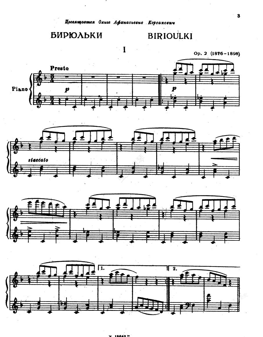 儿童游戏 Op.2《儿童游戏》 Op.2 ,钢琴套曲,副标题为“十四首钢琴小品”14 ,作于1876年,题献给安蒂波夫()的妹妹奥尔加·康斯坦汀·阿凡纳希叶维奇(Olga)。这是里亚多夫就学圣彼得堡音乐学院期间的作品,每首小曲均无标题,就像舒曼的钢琴套曲,精致而富于浪漫气息。第一首和最后一首有着相同的音乐素材,以示整体性和统一性。1. F大调,3/4拍,急板。2. a小调,3/4拍,快板。3. E大调,3/4拍,小快板。4. 降A大调,2/4拍,火热的快板。5. B大调,3/4拍,活泼的。6. e小调,5/4拍,快板。7. F大调,2/4拍,中板。8. A大调,2/4拍,中庸的快板。9. G大调,3/4拍,平静的小快板。10. 降B大调,2/4拍,快板。11. C大调,3/8拍,圆舞曲速度。12. 降B大调,3/8拍,最急板。13. A大调,2/8拍,活泼的。14. F大调,3/4拍,急板。