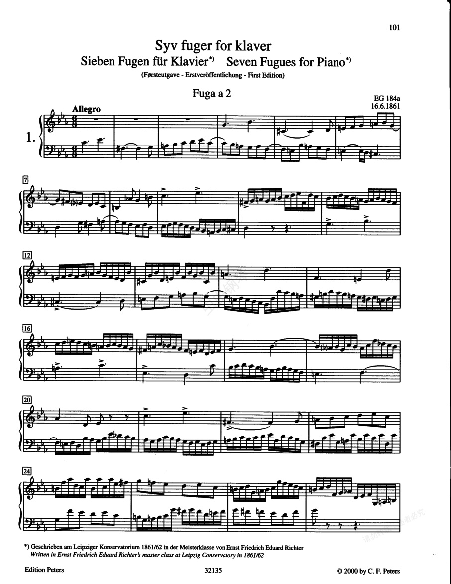 7首赋格 7《七首赋格》7 ,作于1861-1862年,是格里格在莱比锡音乐学院的厄尼斯特·李赫特(Ernst)大师班学习时的习作,乐谱以遗作的方式于2000年出版,并由普莱特涅夫进行全球首次录音。1. c小调二声部赋格 Fuga à 2 in c Minor EG 184a ,作于1861年6月16日,6/8拍,快板。2. C大调二声部赋格 Fuga à 2 in C Major EG 184b ,作于1861年6月,6/4拍。3. D大调三声部赋格 Fuga à 3 in D Major EG 184c ,作于1861年10月10日,4/4拍,不太慢的行板。4. a小调三声部赋格 Fuga à 3 in a Minor EG 184d ,作于1861年10月21日,2/2拍,快板。5. g小调四声部赋格 Fuga à 4 in g Minor EG 184e ,作于1861年11月12日,4/2拍,不过分的快板。6. C大调三声部赋格 Fuga à 3 in C Major EG 184f ,作于1862年1月31日,2/2拍,有力的快板。7. g小调二重赋格 Fuga in g Minor ,作于1862年2月19日,2/2拍,不太慢的行板。