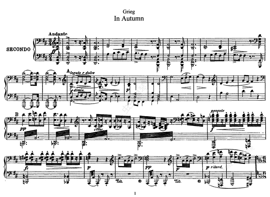 秋季 In Op.11 - 管弦乐序曲格里格的管弦乐序曲《秋季》In Op.11 ,作于1866年,描绘的是一幅色彩斑斓的全景画,快乐生动地描绘了挪威的秋季。9月下旬的一天,人们可以看到农夫在阳光照耀下的山谷里收割,山坡下的树木已经染成了黄色和淡棕色,山顶高处云层密布、风雨聚集,光裸的山上覆盖着皑皑白雪。作品D大调,3/4拍,行板。主题旋律来自格里格于1865年作的歌曲《秋之风暴》The Storm,有人认为整部序曲都是这首歌的翻版,这完全是一种误解。原歌较长,不只描绘了秋天来临的暴风雨,还歌唱了冬天和春天。而格里格的序曲只借用了歌曲的开始部分,描写狂风暴雨撕扯下山毛榉树的叶子,大地铺满了层层落叶。他否认这首序曲中有春天的乐思,但描绘秋天的乐思范围很广,因为表现暴风雨的逐步主题现在通过旋律的巧妙转变进入了第二组主题,饱含了秋季的温暖和满足感。扩展的尾声则完全是另一回事,它具有挪威传统风格,格里格在总谱注脚中表明它是一首收割者之歌。在此,音乐聚集了乡间收获时节的一切欢乐和幸福,形成一支狂欢式的凯歌。这部作品完成之时,挪威瓦姆特公司拒绝出版。而加德看了总谱后更说:“格里格,这是件废物,回去写些更好的。”格里格那时确实承认这部作品配器很糟,后来把它改编成了钢琴二重奏,1867年出版,并以此获得了斯德哥尔摩音乐学院奖。1887年格里格为它重新配器。在1888年伯明翰音乐节上,由他亲自指挥了首演。在节目单上,最后一段标上了“收获者之歌”。