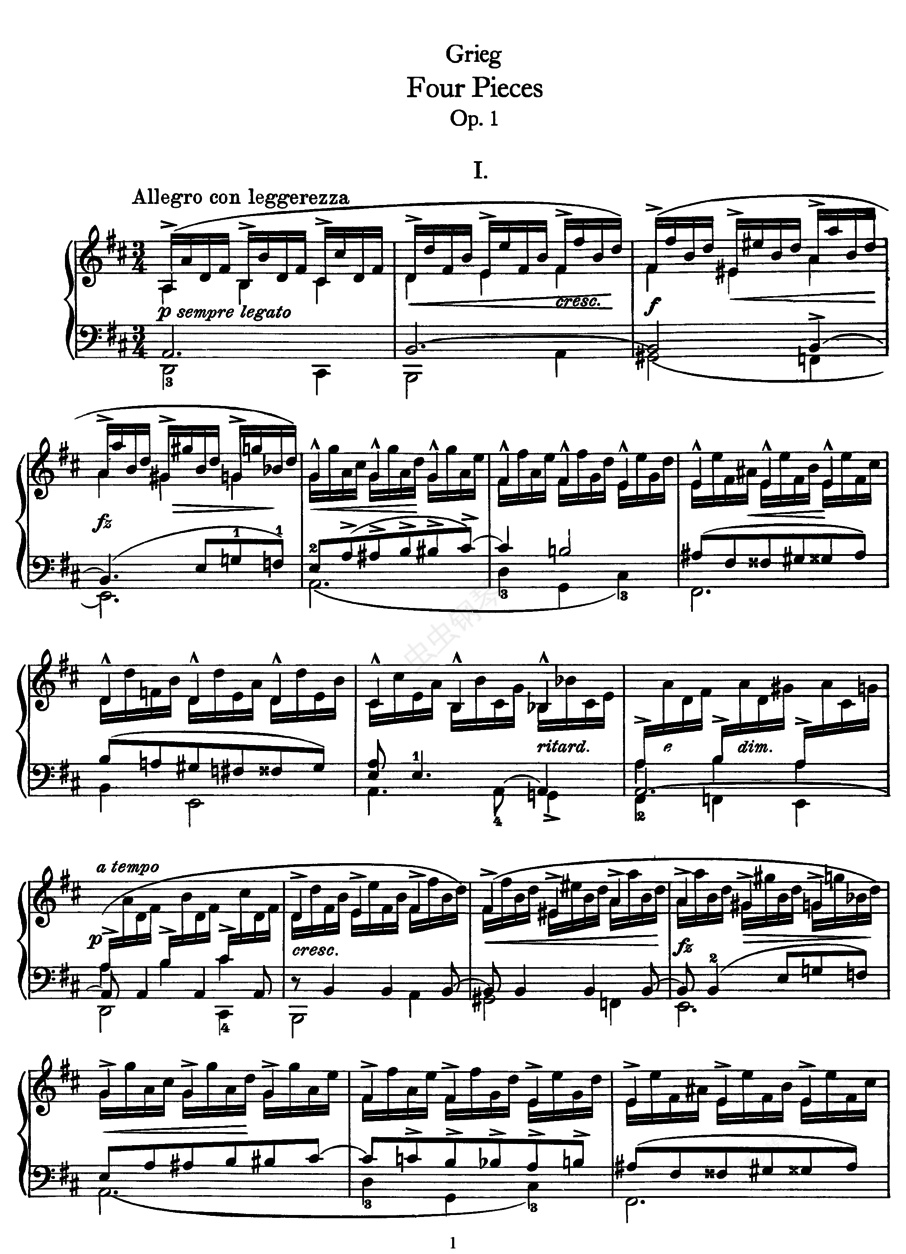 4首小品 4 Piano Op.1《四首小品》Vier Op.1 ,作于1861-1863年,题献给他在莱比锡音乐学院的钢琴老师厄恩斯特·费德南·温泽尔(Ernst, 1808-1880)。这些作品尚未形成格里格自身的风格,可以看见肖邦、舒曼及门德尔松对作曲家的影响。1862年4月,格里格首演了其中的第1、2、4首,作为他在莱比锡音乐学院的毕业考试。第3首则作于1863年,当时格里格已身在伯根()。1. D大调,3/4拍,轻盈的快板。2. C大调,4/4拍,极富表情的不过分的快板。3. a小调,标题为“玛祖卡” ,3/4拍,优雅的。4. e小调,2/4拍,很快的小快板。
