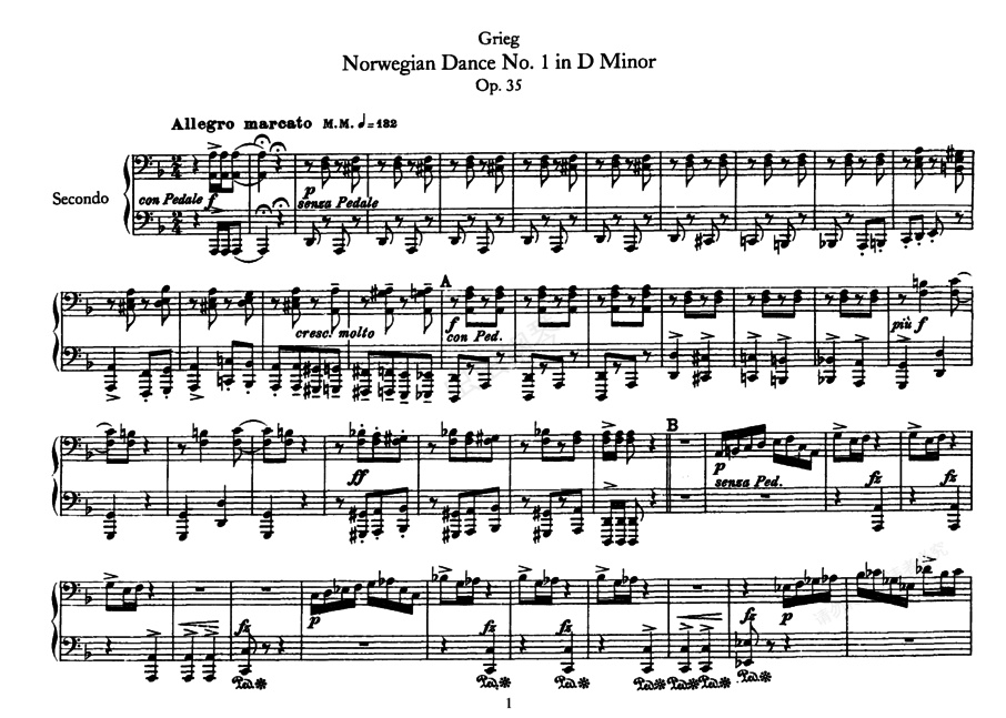 4首挪威舞曲 4 Op.35 《四首挪威舞曲》Four Op.35 ,作于1880年,为钢琴四手联弹而作。于1887年格里格又将其改编成钢琴独奏版。这四首乐曲全是挪威的乡村舞曲,均为二拍子,其采用的民族性素材同勃拉姆斯的《匈牙利舞曲》、德沃夏克的《斯拉夫舞曲》极为相似,其色调独特、织体干净细腻,跳动的旋律,热烈的节奏,诠释出粗犷而富于激情的民族舞曲特色。音乐具有鲜明的民族色彩,优美而动听,随后还被汉斯·席特(Hans Sitt)改编成管弦乐队版本,使之更广为流传,其中以第二首A大调最为有名。1. d小调,2/4拍,清晰的快板,三部曲式,中段转入如歌的D大调,再现主部时变得更生动。2. A大调,2/4拍,优雅而平稳的小快板,三部曲式,主部开始以三个音连接成复倚音出现,短促的断奏和跳进的旋律音型与后面出现的节奏以及较弱的力度,主题具有跳跃般的旋律音型,合着从容而庄重的节奏,正好形成了轻松而安详的气氛。它反复后又忽然加快速度,以强音响奏出对比鲜明的副部。副部主题采用升f小调,主题粗犷而富于激情,使乐曲形成热烈的高潮,与主部对比强烈。但其主题素材之间却有着密切的关系。最后一段再现了主部,乐曲结束在平稳而又轻松的气氛之中。这是格里格最为著名的作品之一。3. G大调,2/4拍,进行曲风格的中庸的快板,三部曲式,中段转入平静的g小调。4. D大调,2/4拍,甚快板-精神抖擞的急板。以最急板的速度在火热的高潮中结束全曲。