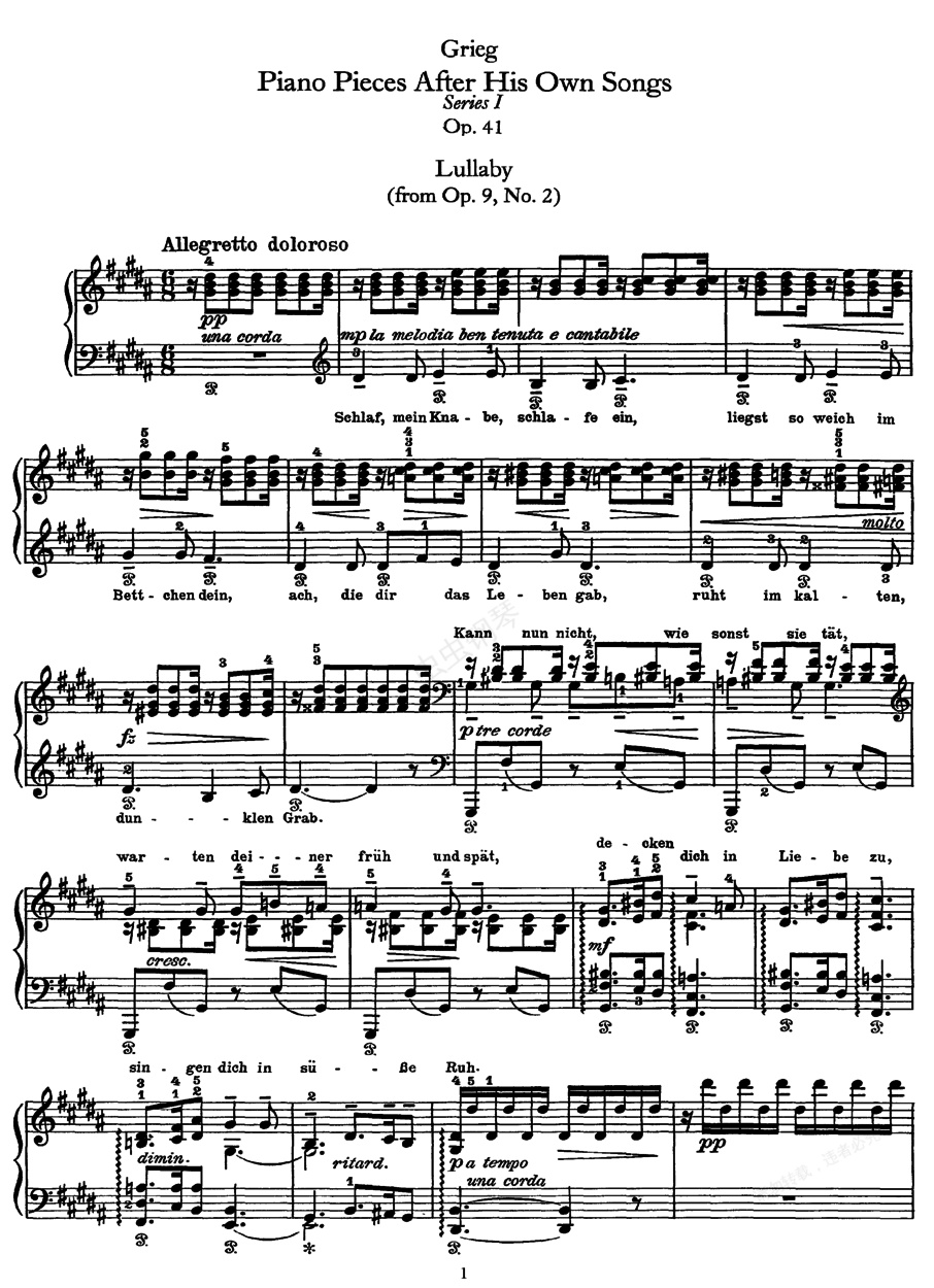 6首歌曲改编曲 6 Piano of Songs Op.41《六首歌曲改编曲》6 Piano of Songs Op.41 ,是由格里格从自己创作的艺术歌曲中挑选出六首最优秀者改编而成的钢琴独奏小品集,于1885年出版。1. 摇篮曲 () Op.9-2 ,改编自《四首歌曲与叙事曲》4 Songs and Op.9 中的第二首,升g小调,6/8拍,悲痛的小快板。2. 玛格丽特摇篮曲 () Op.15-1 ,改编自《四首浪漫曲》4 Op.15 中的第一首,降A大调,2/4拍,充分保持时值的行板。该曲简易钢琴独奏版于1875年曾收入格里格的另一组钢琴曲集《挪威旋律》 of EG 108 中。3. 我爱你 Jeg Dig (I Love Thee) Op.5-3 ,改编自《内心的歌》 of the Heart Op.5 中的第三首,C大调,3/4拍,行板。这是格里格最为人熟知的一首艺术歌曲,其简易钢琴独奏版于1875年曾收入格里格的另一组钢琴曲集《挪威旋律》 of EG 108 中。4. 冰清玉洁 Hun er saa hvid (She Is So White) Op.18-2 ,改编自《四首浪漫曲》4 Op.18 中的第二首,e小调,6/8拍,朴素的小快板。5. 公主 (The) EG 133 ,改编自无编号同名歌曲,d小调,4/4拍,小快板。6. 春之歌 Jeg Giver Mig Digt Til Varen (To) Op.21-3 ,改编自根据比昂斯梯亚纳·比昂松的《渔家少女》改编的《四首歌曲》4 Songs from The Op.21 中的第三首,B大调,4/4拍,活泼的快板。