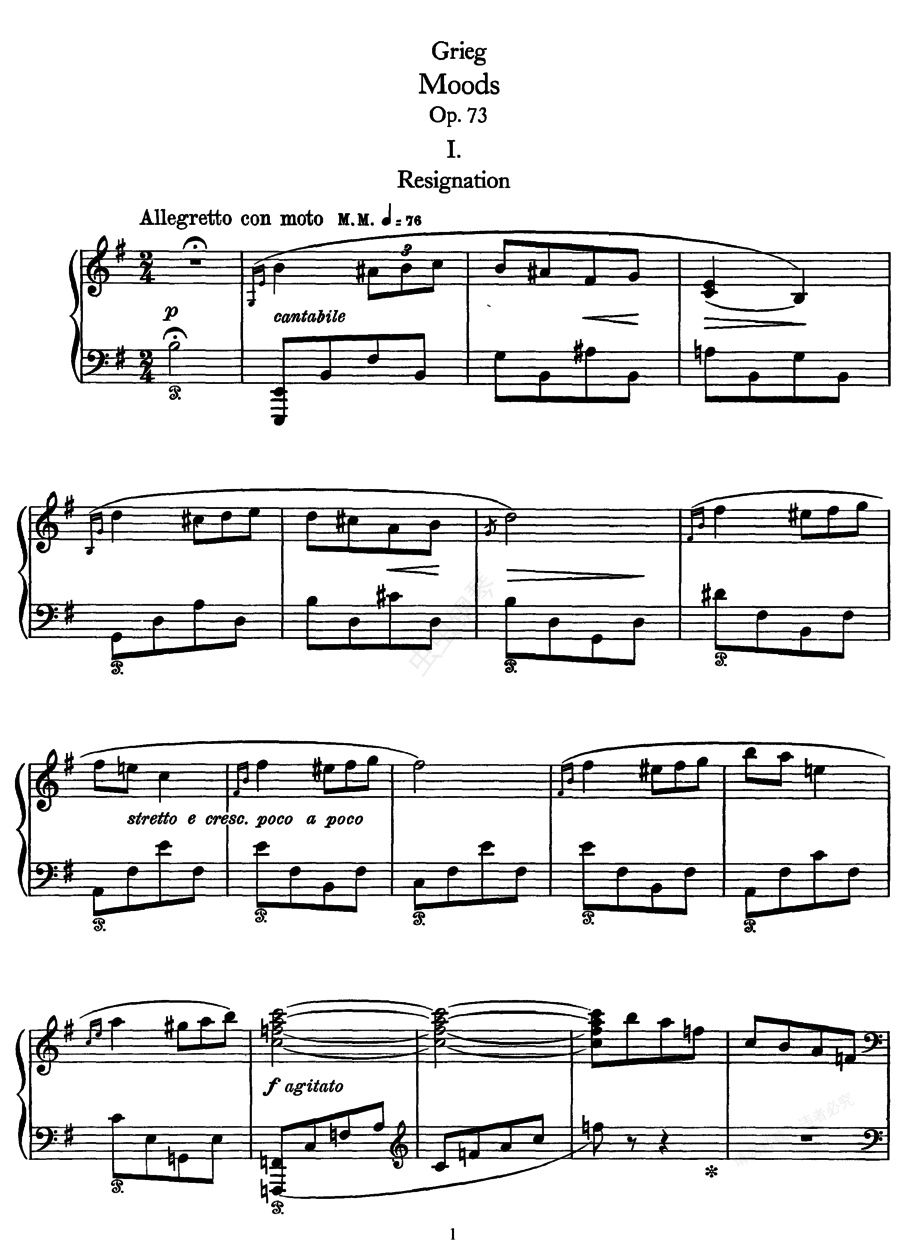 心情组曲 Moods Op.73《心情组曲》 Op.73 ,作于1901-1905年,于1905年出版,是格里格生前发表的最后一部钢琴作品。共由七首小曲组成。其中有部分是在早年(1867、1898和1901年)一些手稿的基础上修改而成。1. 无奈 ,e小调,2/4拍,稍快的小快板。原手稿标题为“怀念朱利斯” nach ,献给他的德国朋友朱利斯·伦琴()。2. 谐谑即兴曲 ,降B大调,2/4拍,随想风格快板。动听的旋律加上惬意的节奏,表达出愉快的心情。3. 夜骑 Ritt ,d小调,3/4拍,神秘的快板。描绘的是邪恶的女巫在夜间飞驰的景象,其中有着特色的和声与节奏。4. 民歌 ,降A大调,2/4拍,田园风格行板。宛如用羊角吹出的旋律,平静怡人。旋律取自林德曼()搜集的民歌集中的第254号华德雷斯()民歌。5. 练习曲“肖邦赞歌” " a" ,f小调,12/16拍,激动的快板。这是一首华丽的手指灵巧练习曲。6. 学生时代小夜曲 der ,A大调,6/8拍,有表情的行板。宛如一首多声部练习曲。7. 山歌 ,g小调,2/2拍,朴素的小行板。用简单的形式充分表现出格里格自身的风格,是这组作品中最为出色的一首。