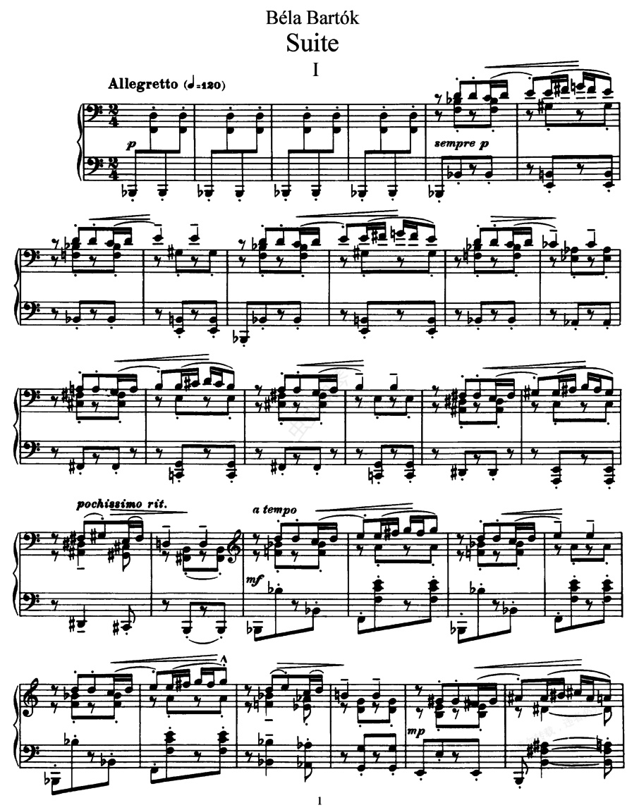 钢琴组曲 Suite Op.14巴托克所作的钢琴作品大多是用匈牙利以及罗马尼亚民歌编曲的小品,但这部《钢琴组曲》Suite Sz.62 在风格上却和以前不同,并没有将民歌的素材直接拿来使用,只用了舞曲风格的节奏、主题的音阶等来加强乐曲的民族色彩。整个组曲由四个乐章组成。第一乐章,稍快板,2/4拍,开始的五小节是建立在降B大调和弦上的节奏型,之后进入E大调和弦。从旋律和低吟的进行看,乐曲是由全音阶构成。但巴托克又将其他的音导入,用以构成为三和弦,作为旋律的辅助音。乐章的结尾用完全的全音阶,并且多次出现。第二乐章,谐谑曲,6/8拍。这是一首以生硬的节奏和音符作成的谐谑曲,具有明显的巴托克风格。乐曲一开始以分解的增三和弦进行为主,随后成为反向进行。第三乐章,甚快板,2/2拍。这是一个非常急速的乐章,拥有阿拉伯民谣风格。第四乐章,如歌的行板,6/8拍,三部曲式。这是个缓慢的乐章,第一部分开始是以小三度为和弦构成的主题。中间部分则以大三度和弦为主,尾声的六小节有巴托克非常喜欢使用的和弦出现,中声部有两个小三度与纯四度结合的和弦,下声部为降B大调,上声部是与它的关系为减五度的升F大调,以复调来进行,这是巴托克特有的微妙的和声使用方法。