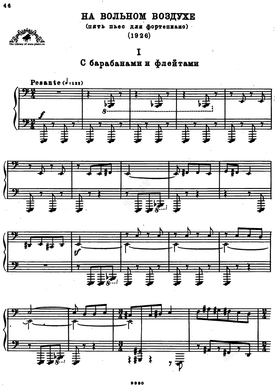 户外 Out of Doors Sz.81《户外》Out of Doors Sz.81 ,作于1926年。这部由五首小品组成、采用匈牙利民歌素材和现代手法进行创作、描绘匈牙利乡村生活的钢琴组曲,是巴托克最重要的钢琴作品之一。首先,这部作品首次使用了他在音乐上的探索成果——“拱形”结构进行创作。巴托克在音乐创作的织体结构与均衡感的构思方面非常细致有序,其中最典型的设置就是“拱形”结构。它是由五个乐章(或部分)呈“拱形”的对称形式组成一部完整的作品,其中第一、五两个乐章采用相同的音乐素材,第二和四乐章也相互有联系,而剩下的中间乐章就是作品的核心所在。除了这部钢琴曲集外,《第四弦乐四重奏》、《第五弦乐四重奏》和《第二钢琴协奏曲》都使用了这样的布局。歌剧《蓝胡子城堡》’s 和芭蕾舞剧《神奇的官僚》The 也是类似的形式,只是不甚严格。其次,作品中的“夜曲”乐章亦是巴托克最早使用他喜爱的“夜晚”作为创作题材的范例——由于巴托克对农村社会的民间音乐报以强烈的兴趣,大自然以及夜间的音响世界也使他十分迷恋。除外这个“夜曲”乐章,他的三部钢琴协奏曲的慢板乐章都以不同的方式表现出同样富有神秘感的扑朔迷离的意境(最后一首还加上了巴托克在北卡洛莱纳州采录的鸟鸣声)。《第四弦乐四重奏》的慢板乐章更是充满了新奇的魔力,我们还能从中听到小鸟的啾唧,昆虫翅膀的颤鸣和青蛙的鼓噪。1. 鼓笛和鸣 With Drums and Pipes ,粗犷的,2/4拍。低音区双音有节律地模仿鼓声,中音区配合以模仿笛声的旋律。2. 船歌 ,行板,6/8拍。摇摆不定的旋律和节奏表现了不安的情绪。3. 风笛舞曲 ,中板,2/4拍。原为同年创作的《钢琴奏鸣曲》末乐章的间奏部分,后被作曲家撤销而独立出来成为这首作品。其中有模仿风笛的颤音。4. 夜曲 The Night's Music ,慢板,3/2拍。题献给他的妻子蕾姆·帕斯特利。这是这部作品中最长、最优秀的一首,其中有模仿蟋蟀和蛙的鸣叫,以及从远处传来的乡村酒馆的歌声。5. 狩猎 The Chase ,急板,6/8拍。让人联想去巴托克《钢琴组曲》Op.14 的第三首,但在这里是更为激烈和生动的追捕场面。