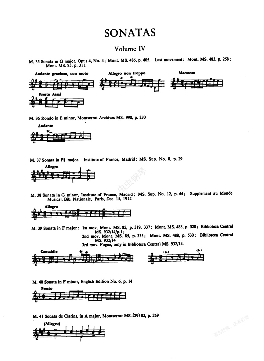 G大调钢琴奏鸣曲 Piano in G Major M35《G大调钢琴奏鸣曲》Piano in G Major Op.4-4 ,作于1780年,共四个乐章。第一乐章,优雅而甚快的行板,2/4拍。第二乐章,不过分的快板,2/4拍。第三乐章,小步舞曲,由庄重的和甚快的两首小步舞曲组成。第四乐章,甚急板,3/8拍。36. e小调,标题“回旋曲”Rondo,3/4拍行板-2/2拍快板。37. 升F大调,3/4拍,快板。38. g小调,6/8拍,小快板。40. F大调,2/2拍,急板。41. A大调,2/2拍,快板。