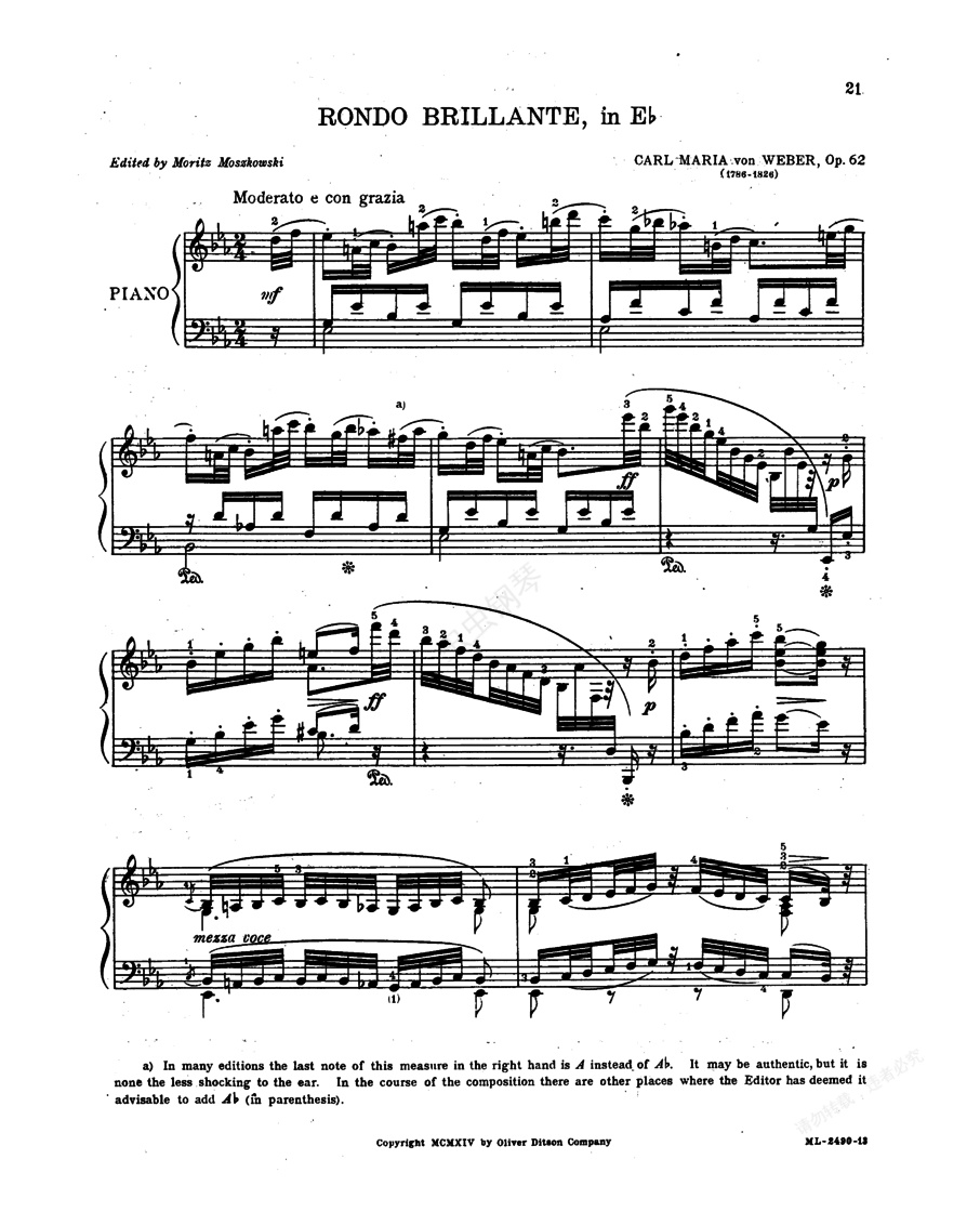 降E大调华丽回旋曲“欢乐”Rondo "La gaite" Op.62《降E大调华丽回旋曲“欢乐”》Rondo in Major "La gaite" Op.62 ,作于1819年。这首作品是在韦伯的钢琴作品属于非常优美华丽的一首。采用优雅的中板,降E大调,2/4拍。作品结构为,其主要主题是轻妙的旋律。第一插部主题由左手呈示,是热情洋溢的降B大调旋律。主要主题再现后,第二插部主题辉煌灿烂的呈现,随即是主要主题的发展。然后第一插部主题以主题再现,最后主要主题强劲奏出,全曲辉煌地结束。