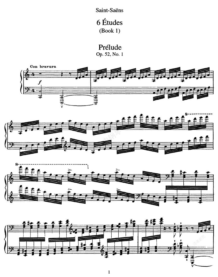 6首练习曲 Six Op.52圣-桑创作的带编号的练习曲作品共三部,分别是Op.52、Op.111 及为左手而作的Op.135。这些练习曲是体现他高超钢琴技巧的典范之一,技巧艰深,并且每一首练习曲都附有标题。近年来亦开始逐步被选用在钢琴演奏教学中。《六首练习曲》Six Op.52 ,作于1877年。1. 前奏曲 ,C大调,4/4拍,带有辉煌色彩的,用双手齐奏出快速的音阶、琶音、双音、和弦等练习。2. 手指独立练习曲 Pour l' des ,a小调,4/4拍,悲怆的小行板。旋律声部隐藏在持续演奏的和弦中,充分锻炼各指的独立性。3. f小调前奏曲与赋格 et Fugue en fa ,f小调,前奏曲为4/4拍,快板,双手交替双音及手腕的练习曲;赋格为2/2拍,生动地,声部练习曲。4. 节奏练习曲 Etude de ,降A大调,2/4拍,小行板,二对三练习曲。5. A大调前奏曲与赋格 et Fugue en la ,A大调,前奏曲为4/4拍,中速的快板,六度双音练习曲;赋格为4/4拍,中板,声部练习曲。6. 圆舞曲风 En forme de Valse ,降b小调,3/4拍,圆舞曲速度,以双手齐奏,双音为主的综合练习曲。