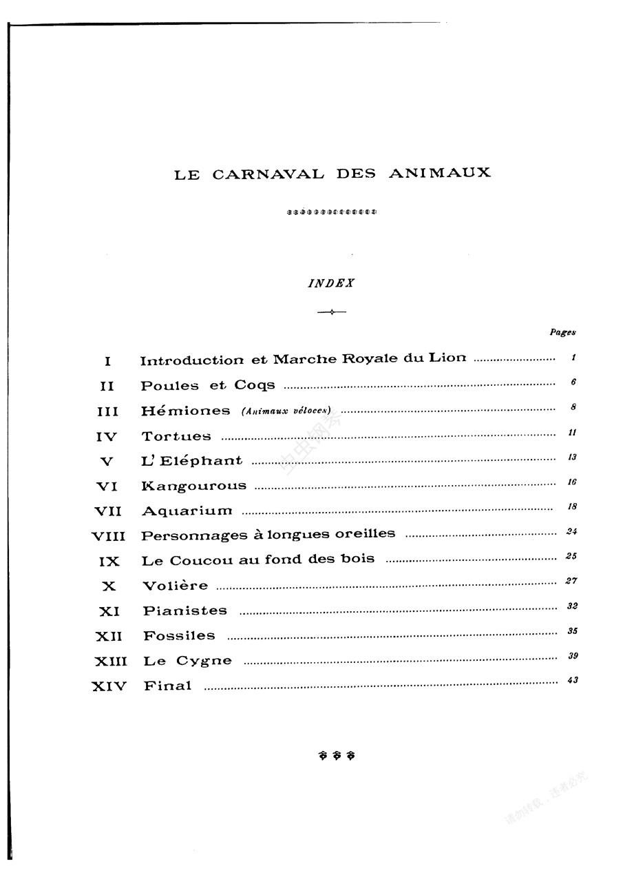 动物狂欢节 Le des - 管弦乐组曲1886年,圣桑先后到德国奥地利等地作巡迴演出,然而因为之前对瓦格纳的评论,引来一阵的杯葛,音乐会受到阻挠,圣桑感到灰心,途中曾在奥地利一个小镇的音乐狂欢节,应巴黎好友的请求,为这个狂欢节写作了一部别出心裁、谐趣横生的管弦乐组曲《动物狂欢节》 of The 。圣桑把这部作品作了一次私下演出之后,为避免引起別人的误会,除了第十三曲“天鹅”之外,其他都禁止公开演奏与出版,直到聖桑去世之后的1922年2月25日,才在巴黎的音乐会上首次公开演奏。整部组曲由十四首小曲组成,每首小曲均有标题。圣桑在这首组曲中,巧妙地融入其特有的机智、幽默与讽刺的性格,用自由奔放的曲调做成,引用许多通俗名曲的片断,不但不曾产生卑俗之感,还抱持着高雅的风趣,可见圣桑创作非凡手法之一斑。巧妙地运用各种乐器音色以及表情的特征,使每种使用的乐器都发挥到最大的功能。1、序奏和狮王的进行曲 and Royal March of the Lion,由双钢琴的序奏开始,出现雄伟庄严的进行曲,表示狮子的登场;这只万兽之王,迈著堂皇的步伐,带领看动物们的行列。2、母鸡和公鸡 Hens and,母鸡用单簧管表示,公鸡则以最高音的钢琴表达。3、野驴 Wild Asses; quick,由两架钢琴飞驰般的演奏,描写在辽阔的草原上,奔跑追逐的野驴。4、乌龟,这一段音乐是取用作曲家奥芬巴赫的《天堂与地狱》序曲中的一段,活泼快速的康康舞旋律,在此曲中以慢吞吞的速度演奏出来,跟前段恰成鲜明的对比。5、大象 The,在钢琴的圆舞曲节奏后,圣桑别出心裁地使用倍低音提琴来表现大象那笨重迟钝的形象,奏出柏辽兹所作《浮士德的沉沦》中,妖精之舞的旋律以及门德尔松《仲夏夜之梦》中的谐谑曲。这些轻快的音乐,圣桑却将它拿来描写大象笨拙的步伐,与滑稽可笑的舞步。6、袋鼠,袋鼠以长而健的后腿,踢著地面向前跳跃行进。袋鼠那出奇的长且大的尾巴,也能帮助其跳跃平衡的动作。圣桑用两合钢琴交替奏出的装饰的乐句,描述袋鼠轻快的动作。7、水族馆,由钢琴弹奏出轻缓的琶音,有如玻璃水族箱里头清水的波动,长笛与弦乐,奏出安详的旋律,描述在水中悠游的鱼。8、长耳人(驴) with Long Ears,由第一和第二小提琴,交互奏出特别的乐句,像是一头驴头人身的怪物嘶叫的声音。9、林中杜鹃 The in the of the Woods,钢琴的和弦表现幽静的森林,模仿杜鹃的单簧管反覆的奏出两个单音——咕!咕!10、大鸟笼,由弦乐器的颤音来表示鸟儿振翅飞翔的声音,长笛主奏表达小鸟飞跃的情景;钢琴则模仿鸟笼中小鸟的鸟叫声。11、钢琴家,这真是一种不可思议的“动物”,曲中反覆弹奏车尔尼的练习曲,讽刺钢琴学生不断机械般苦练单调乏味的音阶,就像动物那样可怜。12、化石,木琴跟管弦乐合奏出圣桑自身的作品《骷髅之舞》中的旋律,描绘着骷髅们跳舞的景象。木琴干枯的音色宛如骷髅们相互碰撞所发出的声音。13、天鹅 The Swan,这是本组曲中流传最广的一首,也是在圣桑生前发表的唯一的一首。常被单独演奏,甚至成为圣-桑的代表作品。本曲是整部组曲中唯一一首优雅、温柔的小曲,与其他各曲形成鲜明的对比。一般认为《天鹅》是全组曲中最精美、最著名的音乐,曲中竖琴的琶音伴奏表示清澄的湖水上荡漾的微波,大提琴优美迷人的曲调,则描写出天鹅高贵优雅的神姿,以及安详自在地浮游时的情景。全曲由伴奏竖琴水波荡漾般的前奏开始,接着大提琴唱出6/4拍圆滑奏的高雅旋律,时而上行,时而下行,情调极为优美。竖琴伴奏的节奏与音型均与前奏相同,与大提琴的曲调融和无间。结尾乐句也很美,全曲在最弱奏中逐渐消失。14、终曲,这是最后所有动物一起活跃热闹的大团圆场面。最后汇集成欢乐的气氛,在灿烂欢愉的高潮中结束。