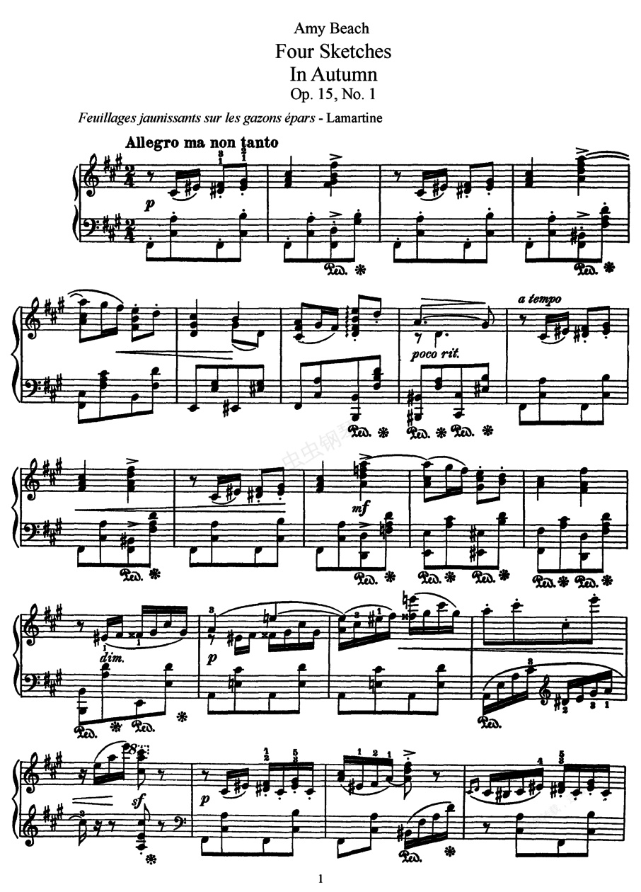 4首素描 4 Op.15比奇夫人的许多钢琴个性小品是由三到五首短曲所组成的套曲,这类个性小品集除了共有的一个大标题外,组成的小曲各自另有标题,而且它们相互之间没有必要的关联。因此就如同舒曼和勃拉姆斯的一些个性小品集, 可以选曲演奏,不一定要整套依序全弹。《四首素描》Four Op.15 完成于1892年,在每一首小品标题下方,印有启发比奇夫人灵感进而创作该曲的诗文。1. 秋天 In ,升f小调,2/4拍,适度的快板。其诗文引自法国诗人阿方斯·德·拉马丁( de, 1790-1869) 的一行诗,中文译为“枯黄的树叶散落在草坪上”。本曲三段曲式,A段(1-38小节)有等长的两个乐段,主题各出现两次,主要利用和声和旋律在单一主题的变奏手法,将主题每一次都以不同的姿态出现。在调性上,两乐段均以升f小调开始,以A大调结束。B段一开始就用A大調拿坡里和弦的属七和弦带出主题,在新的段落开始不立刻出现新调的主和弦,是比奇夫人常用的手法,接著就是一连串以B主题为基础的模进转调,在B段第一个乐段结束后,A主题的前半再现于左手,后半则以右手承接,是比奇夫人在转接段典型的用法。接近曲終的高潮处,右手含八度的和弦及左手琶音与八度大跳将B主题完整复述一次,接著以A主题的动机配合逐渐单薄的音型和渐弱的音量结束。钢琴技巧包括许多左手分解和弦的持续大跳,和右手平行六度平行三度的进行,曲中为了表现出诗文中“树叶散落”的情景,常出现断奏及非连音的弹奏要求,在弹奏上要区分清楚,左手伴奏的和弦大跳要很谨慎的控制触键的力度,以免产生不必要的重音。2. 幽魂 ,A大调,3/8拍,谐谑的小快板。灵感源自诗人维克托·雨果( Hugo, 1802-1885) 的诗,诗句中文译为“所有脆弱的花朵一出生就死去”。比奇夫人用诙谐的音乐语汇表达这看似忧伤的诗句,颇为耐人寻味。本曲的曲式也是三段式,A段是由向下八度跳进强调在第二拍的主题开始,之后每一句作主题的变奏; 左手的伴奏音型不论是同节奏的大跳或是琶音式的分解和弦,都与主题动机反向进行。第17小节开始,主题的倒影形式出现,直到近A段结尾(30-33小节)才又回到主题原型。和声上,作曲者在第一小节就用德国增六和弦配合A主題的动机,增添音乐的趣味性。B段以较为抒情的主题与A主题作对比,但同样的以下降的旋线来呼应诗句中“一出生就死去”的意象。叼性从升c小调转到同音异名的降D大调,与A段的A大调为中音的三度关系。和声上许多的附属和弦或解决或不解决,使得乐曲充满虚幻的意境。钢琴技巧仍偏好平行六度平行三度的进行,B段近尾声的高潮处,B主題的变奏以八度短暂出现,但左手的伴奏仍保持单纯的分解和弦琶音。3. 梦境 ,降G大调,4/4拍,有表情的稍快的行板。灵感也是源自诗人维克托·雨果的诗,诗句中文译为“你在梦境深处对我说”。此曲只用单一题一气呵成,是典型的联篇创作的曲式,它持续反覆的伴奏音型以及长音如歌的主旋律,让人不得不联想到舒伯特的《降G大调即兴曲》Op.90 No.3,两者也同样用降G大调,只是后者的曲式为三段式。直到第三小节主题出现,降G大调的主音才由V7/IV和弦带出来,而紧接其后的另一个附属和弦V7/ii,恰好形成一半音阶进行(2-4小节),以半音进行作为经过音是本曲的特色之一。和声的应用上,顽固低音与和弦外音的交错运用,常产生如大、小七度的不和谐音程。钢琴技巧除了在双手有需要平静流畅的三连音,右手同时也需负责高音声部的主题旋律,全曲像一首无言歌,只有在段落的尾奏部分才短暂的出现不含旋律的平行四度以及分解和弦琶音。接近结尾处一连串含挂留音及八度的和弦以属音降D为持续低音,达到全曲的高潮。4. 萤火虫 ,a小调,6/8拍,活泼的快板。灵感源自诗人拉马丁的诗,诗句中文译为“与春天同生,与玫瑰同逝”。这首以平行三度为主的作品令人联想到肖邦的《升g小调钢琴练习曲》Op.25 No.6,平行三度在此多以震音或下行音阶的形式出现,涵盖的音域很广,约超过三个八度,本曲在活泼的快板的速度要求下,充分展现出标题“萤火虫”在夜空中闪耀疾驰的景象。本曲是三段式,A段主题建立在右手持续不断的平行三度上,偶而会将三度让左右手交替弹奏,給演奏者喘息的机会。B段从51到62小节,这里主题改以较缓和的节奏与琶音进行,给人短暂放松的感觉。此曲是四首中最长的一首,据说曾是上个世纪初著名钢琴家约瑟夫·霍夫曼(Josef)最喜爱的返场曲之一。技巧的要求也最高,快速的三度双音的震音型和音阶型是曲中需克服的,演奏者一定要找到最适合自己手型的指法,并配合手臂与手掌的合作运动,才能平均流畅的弹奏。