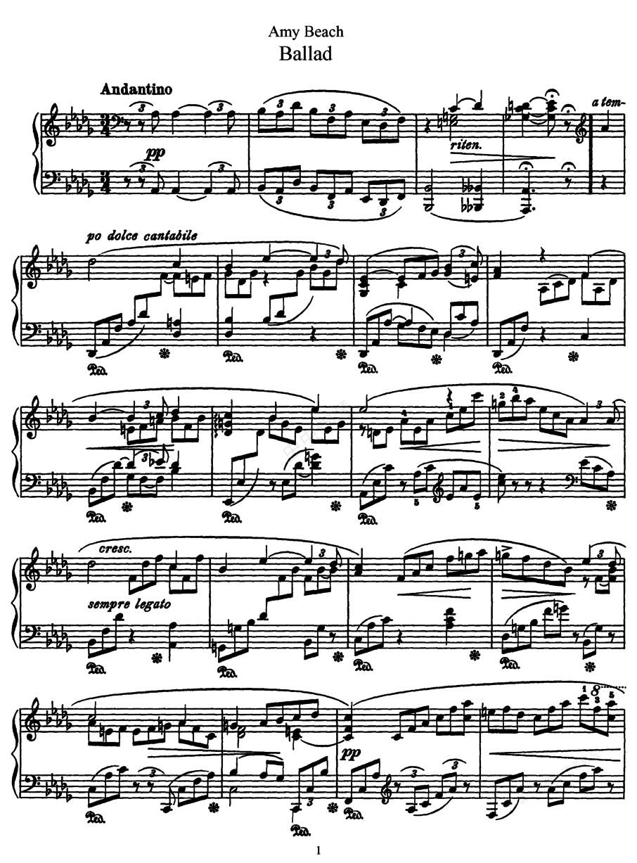 降D大调叙事曲 in Major Op.6《降D大调叙事曲》 in Major Op.6 ,作于1894年,其主题素材来源于比奇夫人早年为罗伯特·伯恩斯( Burns)的诗歌“我的爱象一朵鲜红的红玫瑰”My Love is Like a Red, Red Rose 所作的艺术歌曲伴奏。但这首作品不只是将该艺术歌曲进行改编,而且还进一步展开。它所表达的是永恒的爱情,正如诗歌中所示:亲爱的,我会永远爱你,直到海枯石烂。(Till a the seas gang dry, my dear, And the rocks melt wi the sun, I will luve thee stillŠ.) 。作品为降D大调,3/4拍,甜美如歌的小行板,肖邦风格。其中还有充满热情和力量的高潮段落。