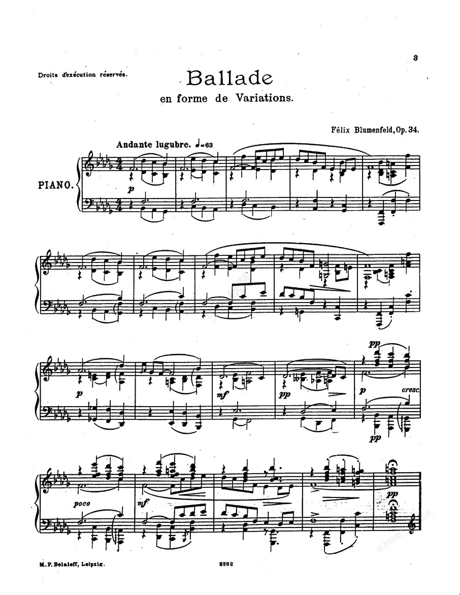 变奏曲式叙事曲 in the form of Op.34《变奏曲式叙事曲》 in the form of Op.34 ,作于1903年,题献给桑德拉·德鲁克先生()。这是值得演奏家们留意的一首作品,布鲁门费尔德以变奏曲为体裁创作了这首悲剧般的叙事曲,全曲为降b小调,其主题以降b小调开始,但结束在f小调上,4/4拍,阴郁的行板。随后的变奏是自由的,随着感情的起伏波动,音乐不断发展,最终进入激烈而不过分的急板终曲。
