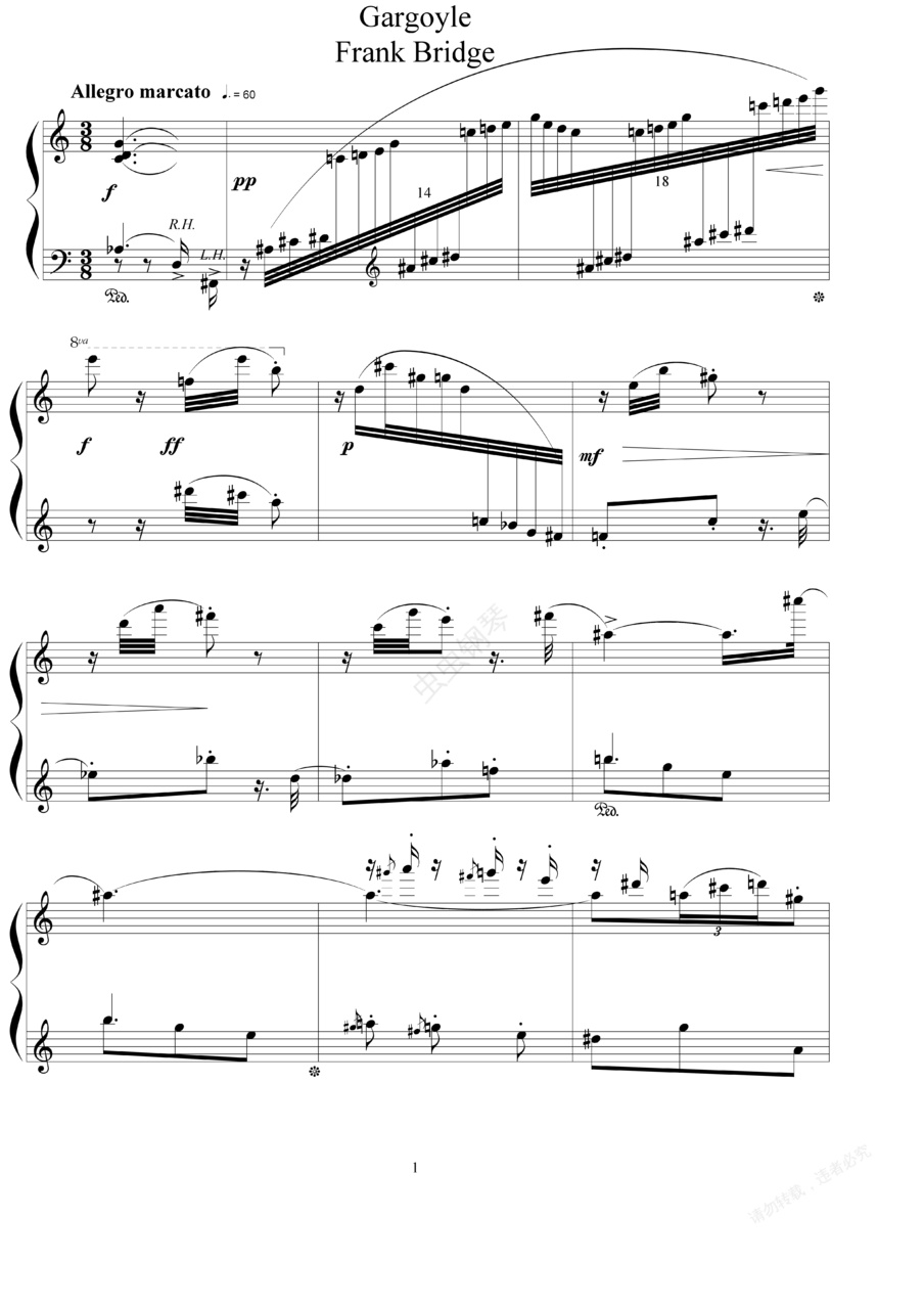恶魔石雕 H.177《恶魔石雕》 H.177 ,作于1928年。这是布里奇所创作的最后一首钢琴作品。在当时,第一次世界大战对音乐界产生了巨大的影响,布里奇也不例外。作品为3/8拍,清晰的快板。虽为C调记谱,但使用的是现代和声和作曲风格。布里奇吸收了当时盛行的各种现代风格,尤其是斯克里亚宾的神秘风格和德彪西的印象派风格,并将其融入到这首作品中。以“恶魔石雕”为标题,因为音乐中描绘的不是装饰在教堂中用于净化丑恶内心及忏悔的石雕圣兽,而是刻画了一个来自地狱索姆河的恶魔。