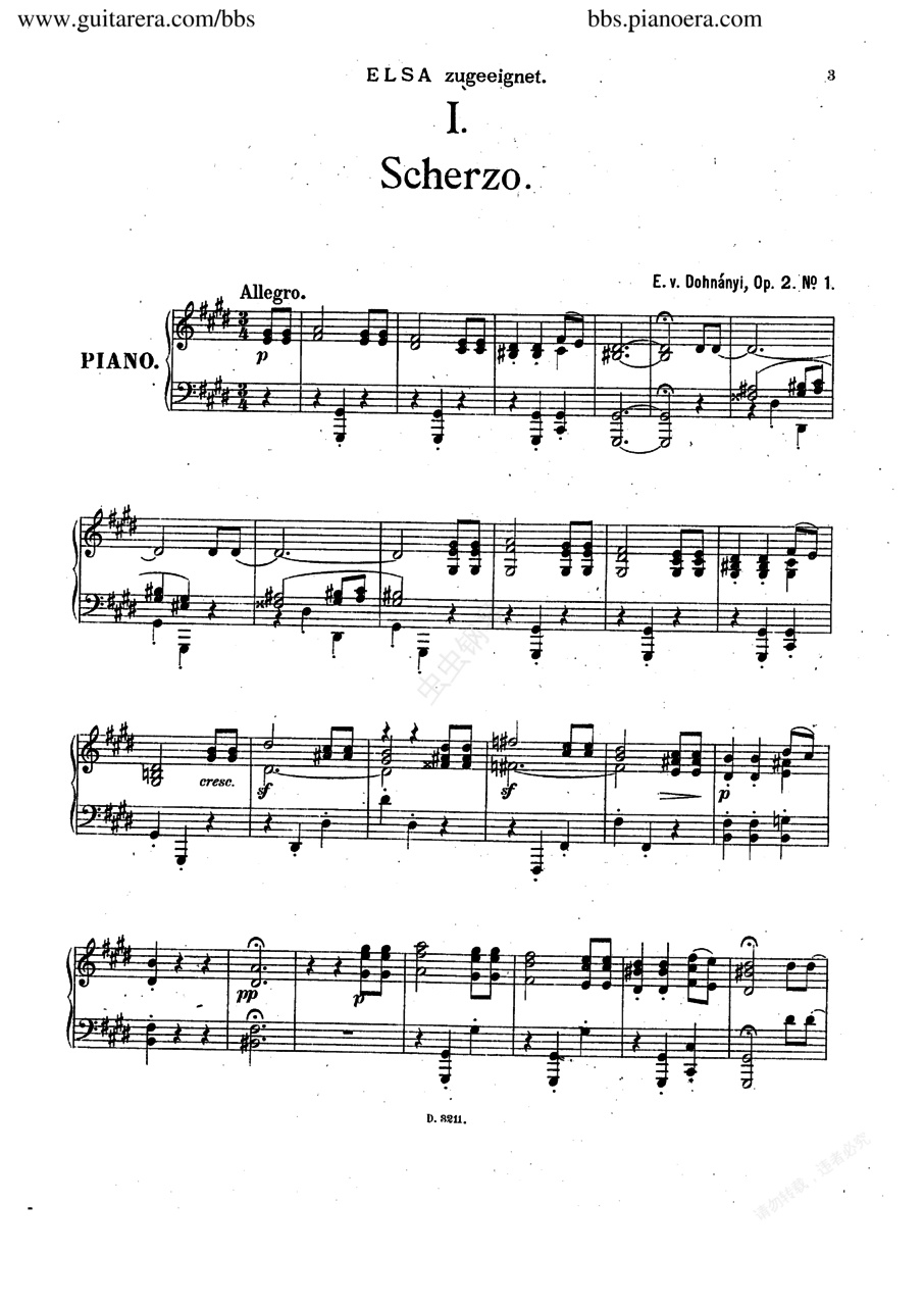 4首小品 Four Op.2《四首小品》Four Op.2 ,作于1897年,于1905年出版。其中可见勃拉姆斯对年轻的多南伊的影响。1. 谐谑曲 ,升c小调,3/4拍,快板。中段为温柔的降D大调。2. a小调间奏曲 in a Minor ,a小调,2/4拍,活泼的。副部为稍快而平静的A大调,其先后出现两次后,短暂地回顾了主部主题而结束。3. f小调间奏曲 in f Minor ,f小调,4/4拍,深情和连贯的。乐谱开头引用了雷涅克()的诗句:无论你到何处,我都会跟随。因为你属于我,你是我最深爱的人。作品最后转入F大调直至曲终。4. 随想曲 ,b小调,3/8拍,激动的急板,回旋曲式。这首令人兴奋的作品最能反映出勃拉姆斯精神。