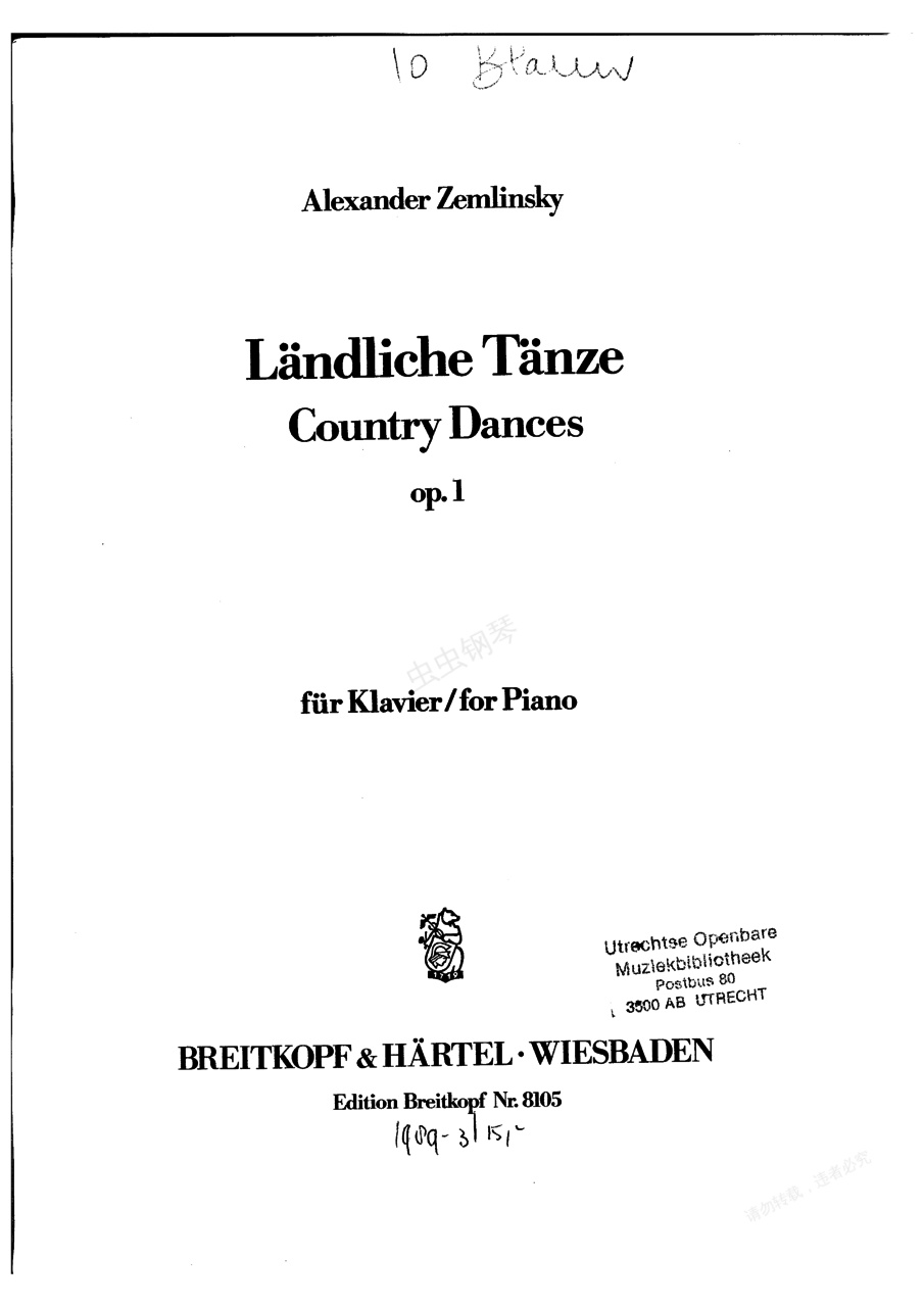 乡村舞曲 Op.1《乡村舞曲》 Op.1 ,这是泽姆林斯基于20岁时(1891年)完成的第一组钢琴作品,由十二首乡土气息浓郁的小圆舞曲组成。这是富于舞曲灵魂的抒情性小品,跟肖邦的圆舞曲一样,并非为了舞蹈而作,其风格和曲式构造等均与舒曼的作品相似。1. C大调,3/4拍,温暖的。2. a小调,3/4拍,轻巧的。3. E大调,3/4拍,梦幻的。4. e小调,3/4拍,朴素的甚快板。5. B大调,3/4拍,梦醒的。6. b小调,3/4拍,有力的。7. F大调,3/4拍,非常轻巧的。8. 降B大调,3/4拍,快活的圆舞曲速度。9. D大调,3/4拍,兰德勒舞曲速度。10. d小调,3/4拍,着重强调的。11. D大调,3/4拍,非常温柔的。和第十二首连续演奏。12. A大调,3/4拍,极其生动的。
