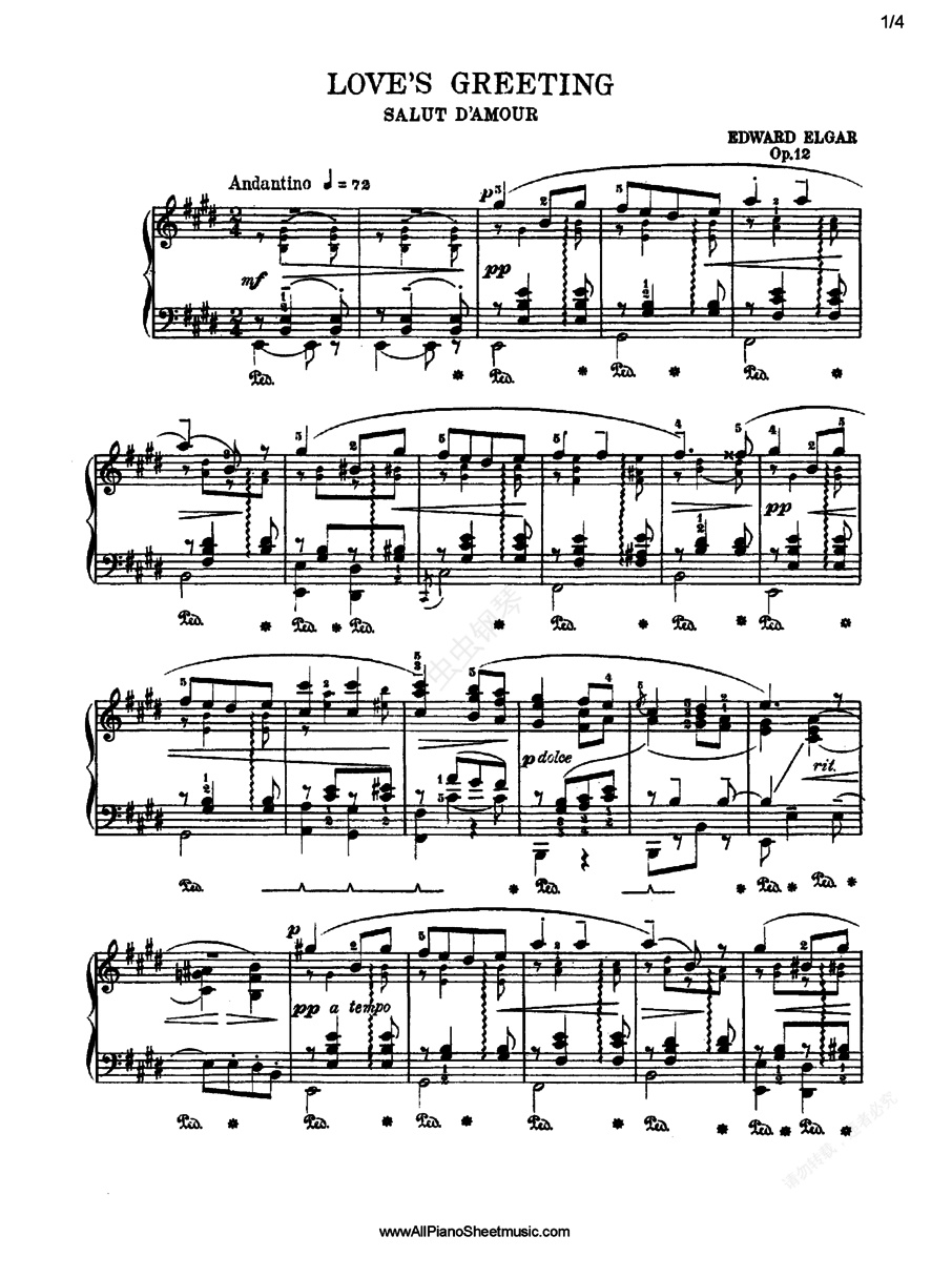 爱的礼赞 Salut d'amour Op.12《爱的礼赞》Salut d'amour Op.12 ,一译《情人的问候》,为钢琴独奏而作,本曲是作者埃尔加的代表作之一,是埃尔加献给其爱妻的生日礼物。本曲具有典型的"小夜曲"风格,轻松而典雅,是极适用于舞会和沙龙等场合的音乐。 乐曲为典型的"ABA"三段体加一个尾声构成。A段主题为E大调,4/4拍子,小提琴在高音区奏出饱含深情的旋律,恰似来自情人的绵绵情话;乐曲的B段主题转为 G大调,柔美的曲调中多了一丝哀怨的情调;经过带有泛音色彩的华丽过门,乐曲又回到A段,经过带有复杂情绪的尾声,全曲在A段主题的变奏形式下逐渐减弱而终了,仿佛是情人还在喃喃私语……此曲曾被改编成小提琴、大提琴、吉他等多种乐器独奏,都取得非常好的效果。