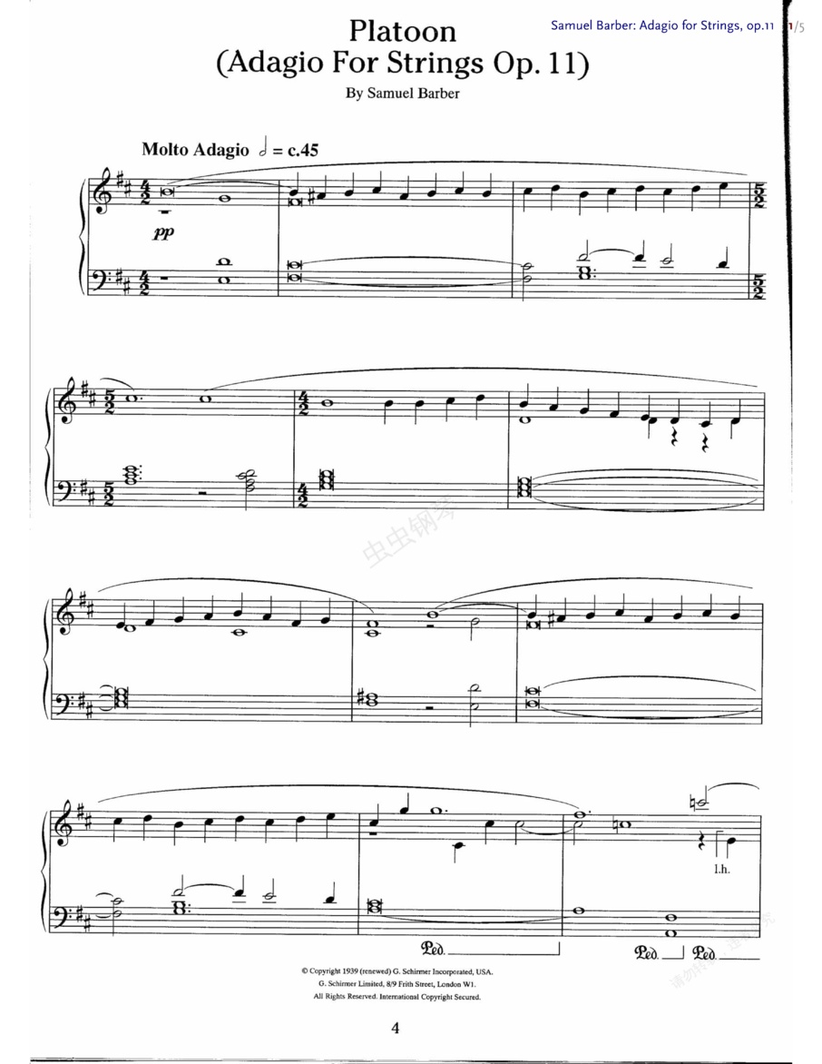 管弦乐《柔板》 Op.11 - 钢琴独奏版巴伯的这首《柔板》 for Op.11(又译《慢板弦乐曲》)原为1936年巴伯26岁时所作的一首弦乐四重奏中的慢板乐章,1938年由他自己改编成管弦乐,并由当代著名指挥家托斯卡尼尼在1938年首次指挥演出,而使这首小曲一举成名。这是一首充满浪漫气息,旋律非常优美的名曲。后人又改变成以多种乐器组合演奏的版本。这首伟大的柔板优雅而又感伤,在绵延的美丽长度中委婉成一个越来越丰富的细腻织体的呈示,高潮处像是悲愤到极点,然后又回归平静中容忍了悲剧的美丽抒情。我每到听它的时候,总想到悲哀、悲悯的情感总是伟大的情感。曾被影片《野战排》用于配乐。它像一条凄清哀诉的飘带,在那美丽的绿色丛林中萦绕而无穷无尽,使血腥的悲剧反思更令人无法释怀。