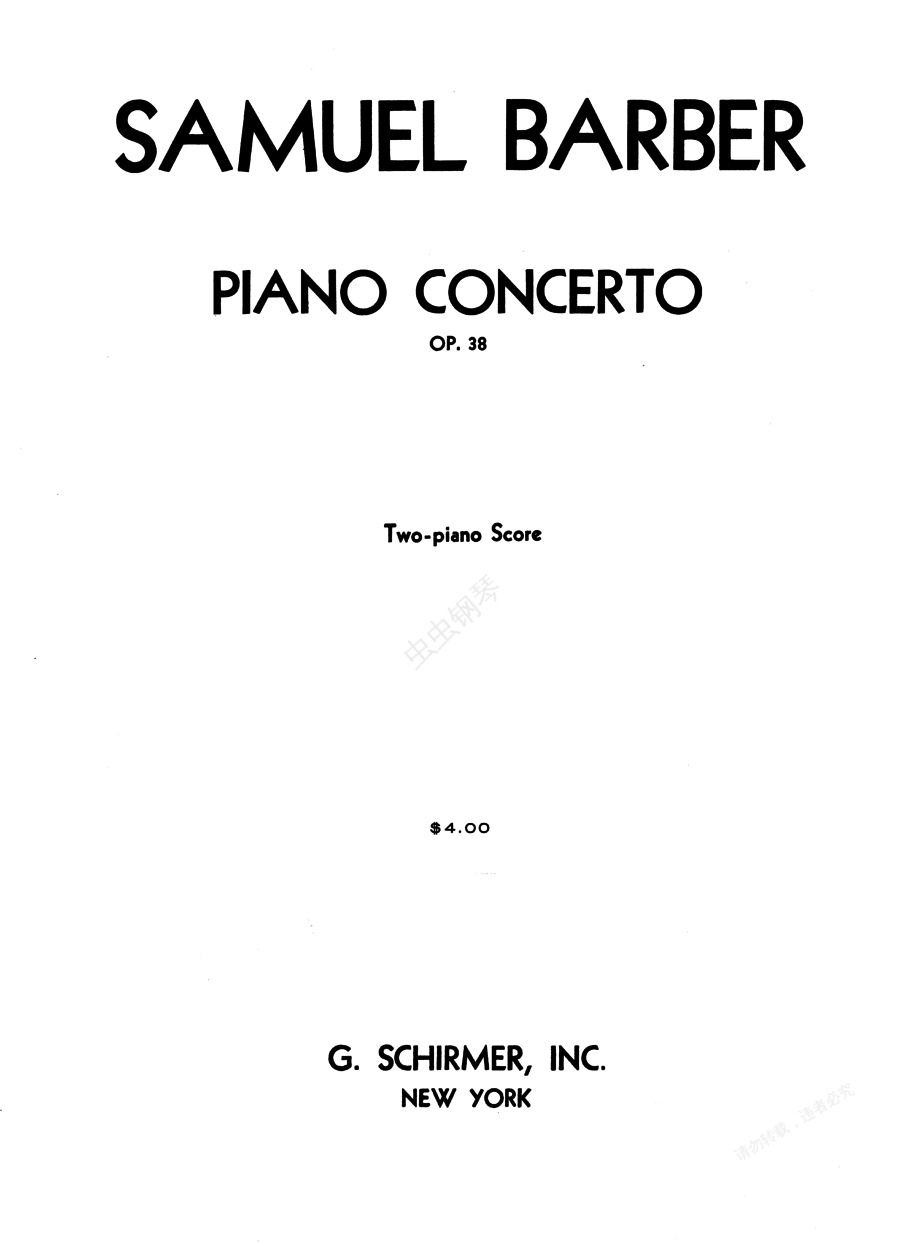 钢琴协奏曲 Piano Op.38《钢琴协奏曲》Piano Op.38 ,作于1961年。作品初演之后,收到了听众和评论家们的欢迎。当时有这样的评论:“巴伯的新作《钢琴协奏曲》在其优雅的手法之下,展露了令人感到温暖的诚实,以及对形式巧妙的处理。不论哪一部分都令人感到美不胜收。”“这首乐曲的确引起听众的共鸣,巴伯先生似乎写熟了常演曲目的乐曲了。”第一乐章,热情的快板,奏鸣曲式。乐曲由钢琴喧叙调似的有力的华彩开始,以齐奏为主题的乐句在开始的八小节中,就把整个乐章的各种要素都表现出来了。随后乐队以强奏和弦化的音型进入,在钢琴以增四度为中心的上行乐句顶点,速度转快,小提琴和高音木管乐器呈示出e小调第一主题。第二主题的速度减慢了一倍,又双簧管极富表情地以强奏在升g小调呈示,之后小提琴齐奏这个主题旋律。展开部开始后出现钢琴的华彩段。接着在小提琴声部的支撑下,钢琴在高音区出现左右手的卡农。再现部和呈示部相同,以乐队用e小调开始,钢琴出现时转为降b小调。第二乐章,中板,二部曲式。在竖琴与加弱音器的第二小提琴以震音伴奏之下,长笛在低音区,接着双簧管以升c小调奏出优美的第一部分主题旋律。第二部分的主题出现时,钢琴附加了装饰音,反复时由小提琴齐奏奏出,钢琴继续装饰化的乐句。第三乐章,极快地,5/8拍。在短小的序奏之后,钢琴以二度音程的粗暴的节奏,奏出打击乐化的主题。这个主题由长号和小号接替之后,再度回到钢琴上。这部分结束在钢琴急速的下行乐句上。速度减慢后,由木琴骤然呈示出新的固定音型,在此上方,单簧管奏出新的插句,随后有钢琴将其移高四度,在钢琴快速音群与独奏小提琴支持下,由长号来反复。不久,由四支圆号齐奏序奏动机与钢琴下行乐句来结束此部分时,速度再度减慢,由三支长笛、低音单簧管。三支加了弱音器的长号和竖琴奏出优雅的插句。这个旋律由钢琴予以反复之后,再由乐队全奏加以最强奏的反复。钢琴插入一小段华彩之后,再度以独奏方式优美地弹奏了它的前半部分。随后气氛转变,由定音鼓连续奏出降G音,以及低音铜管乐器演奏的气氛可怕的序奏动机,接着复现第一主题。钢琴的华彩之后,乐曲以排山倒海的气势冲向结束部。