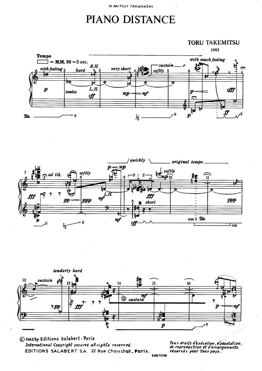 弱奏的层次 Piano《弱奏的层次》Piano ,作于1961年4月,为日本钢琴家兼作曲家高桥悠治(Yuji) 的独奏音乐会而作。于同年10月30日由高桥悠治在东京首演,并于1979年2月4日由琼•陶尔(Joan Tower) 在卡耐基音乐大厅演出。演奏时间大约为四分半钟。在对中西方音乐的探讨过程中,武满彻创作了一些令人震惊而精采的作品,其中就包括这首《弱奏的层次》。作曲家自己形容这首作品为“音在弱奏力度范围的色彩逐级变化”(“the of tone heard in the soft range.”) 同时跟钢琴音响的音色、密度、音量的远近等多种意义的“距离”相关。乐曲规定一小节的时间为3秒,在此时间内,由演奏者使节奏自由呼吸。散板式节奏徐缓的声波,演奏者瞬间的动态,使音响更富有生气。乐曲时而激烈运动,时而沉默,充满密度很高的紧张感。