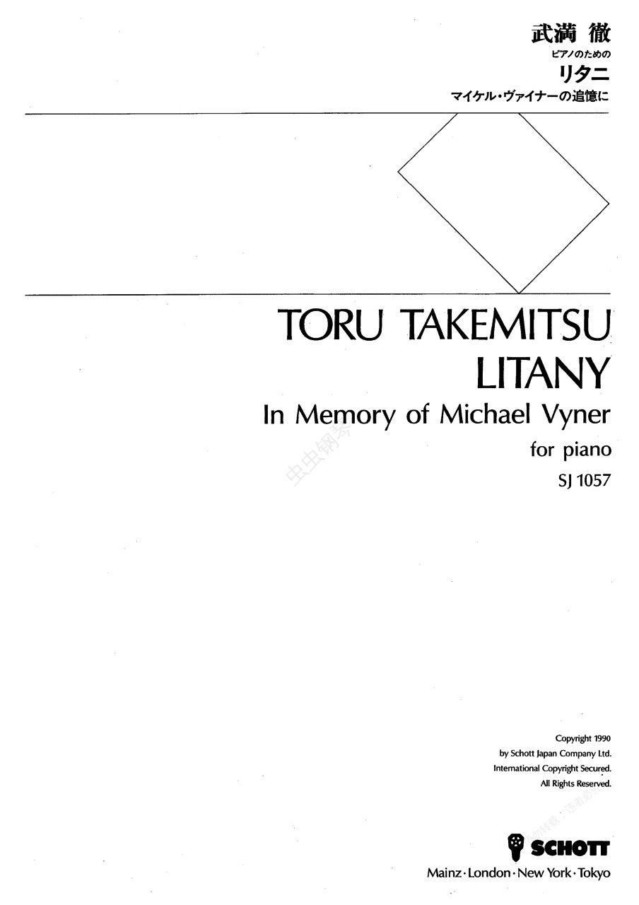 祷文《祷文》 ,为纪念已故的朋友米歇尔·怀纳( Vyner)而作。作于1950年,并于1989年重写,1990年5月6日由鲍尔·克洛斯利(Paul)首次在东京首演,1994年12月13日由艾利萨·加蒂(Eliza Garth)在卡内基大厅演出。这首作品是武满彻最早的作品,当时他正与肺结核病做斗争。师从清濑保二()学习作曲,但他很快就发现了属于自己的音乐方向,并很快就摆脱了传统观念的束缚。最初这首曲子标题为《两个乐章的慢板》Lento in due ,这是非常含混不清及荒谬的,因为它实际上仅有一个乐章,从中分成两部分。武满彻在演奏它一遍后便将手稿遗失了。四十年之后,作曲家将这首曲子草稿上残留的片断,重新写成了这首作品以纪念伦敦指挥家、乐谱出版商怀纳( Vyner)。作品仍以两个乐章的形式出现。第一乐章 柔板 ,以忧郁的f小调开始,和声上令人联想到梅西安与斯克里亚宾。主题素材展开后,出现新的乐思,空旷的八度,稍微有点德彪西及日本风格,已经可以看出武满彻日后所表现出来的融合东西方音乐元素的迹象。乐章后半部分,主题素材与新乐思融合在一起。第二乐章 神秘的慢板 Lento ,有个快速的中段。可见梅西安的影响。如歌的旋律加以高音部分伴奏,可以冠之“水滴”或“露珠”之名。