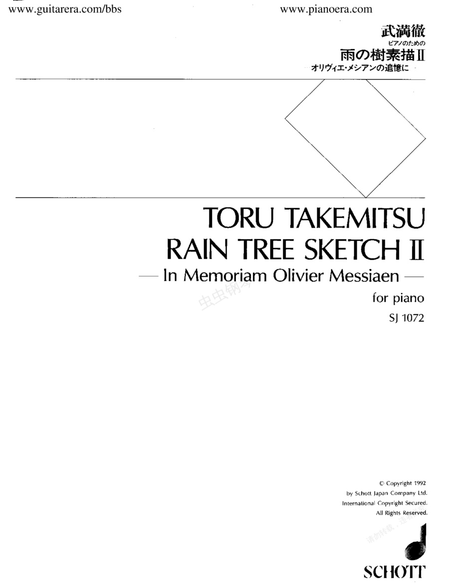 雨树素描 II Rain Tree II - 为纪念梅西安而作《雨树素描 II 》Rain Tree II ,副标题为“为纪念梅西安而作”In 。作于1992年,于同年10月24日于法国中部城市奥尔良举行了世界首演,担任首演的钢琴家为阿连·奈纽克斯(Alain)。并于1997年1月17日由钢琴家凯科·霍里(Keiko Hori) 在卡内基音乐厅的魏尔演奏厅首演。演出的时间大约四分钟。从武满彻近期的作品开始,他便将自己40年来的领悟,尤其是自己对钢琴的独特理解带入到作品中来。作品开头标示“神圣的光” light ,在后面的部分他标示“欢乐的” ,这是用双手演奏出歌唱的回声。作为对梅西安的纪念,这个作品表现了武满彻崇高的先知和理念:天堂是产生于并融合于共鸣的回响中的。