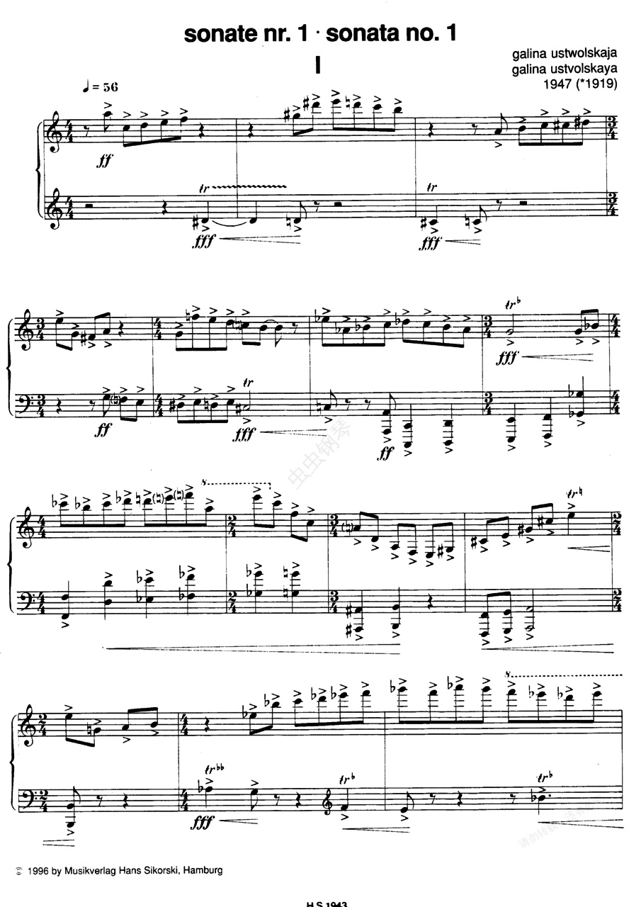 第一钢琴奏鸣曲 Piano No.1乌斯特沃尔斯卡娅的六首钢琴奏鸣曲均无传统的旋律,它们致命的特点是一个个音符都是站直了前进的,干燥的音节咄咄逼人。它们像机械的打击、仿佛铁匠用他们的钢锤敲击着键盘。极致的气氛敲击的就像是雪地里的脚印,冰冷、默然、孤傲。勃然而发的单个灵感,很多地方像火山爆发一般却瞬间又静如冰山。偶尔对泛音的运用使得她的奏鸣曲中出现少有而短暂的德彪西般美妙的旋律。《第一钢琴奏鸣曲》Piano No.1 ,作于1947年。同年肖斯塔科维奇完成他的《第一小提琴协奏曲》Op.99 。这两部截然不同的作品,在1948年初的一场艺术家批判运动中均被指责犯了形式主义错误,只能束之高阁,直到政治上“解冻”时期的到来。于是直到1974年,这部钢琴奏鸣曲方得以首演。该奏鸣曲共由四个乐章组成,但非常精练简短。每个乐章开头都标以明确的速度要求。