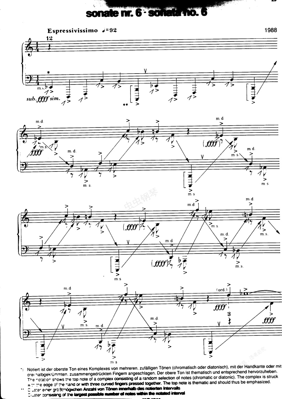 第六钢琴奏鸣曲 Piano No.6《第六钢琴奏鸣曲》Piano No.6 ,作于1988年。这是乌斯特沃尔斯卡娅的代表作,“铁锤女士”lady with a 之名在此得以充分体现。在此之前从来没有俄罗斯作曲家敢如此粗暴地演奏钢琴:用手掌、拳头、甚至是整个手臂以极强的力度、宛如铁锤般敲击出极度不协和的音块,尽管这种技术早就出现在二十世纪初美国作曲家艾夫斯和考威尔的作品中。这部长约七分多钟的作品为单乐章,无小节线,无调性,标以非常有表情的术语,以 的力度奏出,极具爆炸性的力量令人为之震撼,深刻地反映了当时世界政局动荡、苏联政党内部矛盾产生和激化、人们生活在战争的恐惧中的社会背景,是来自列宁格勒的“黑洞”的声音。