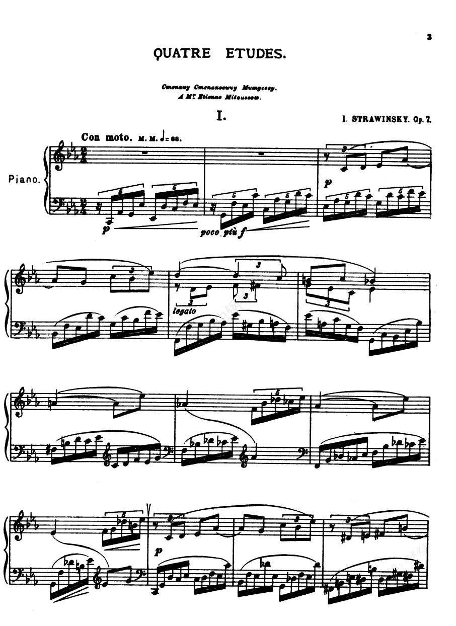4首练习曲 4 Op.7《四首练习曲》Four Op.7 ,是斯特拉文斯基早期的创作之一,表现出对异乎寻常的乐器色彩、狂烈的节奏、严酷的力量与热情的偏爱。是近年来钢琴比赛中常用的作品。1. c小调,2/4拍,稍快的,五对三练习曲。2. D大调,6/8拍,华丽的快板,双音和八度练习曲。3. e小调,6/8拍,小行板,右手扩张及表情练习曲。4. 升F大调,4/4拍,活泼地,右手灵活及左手练习曲。