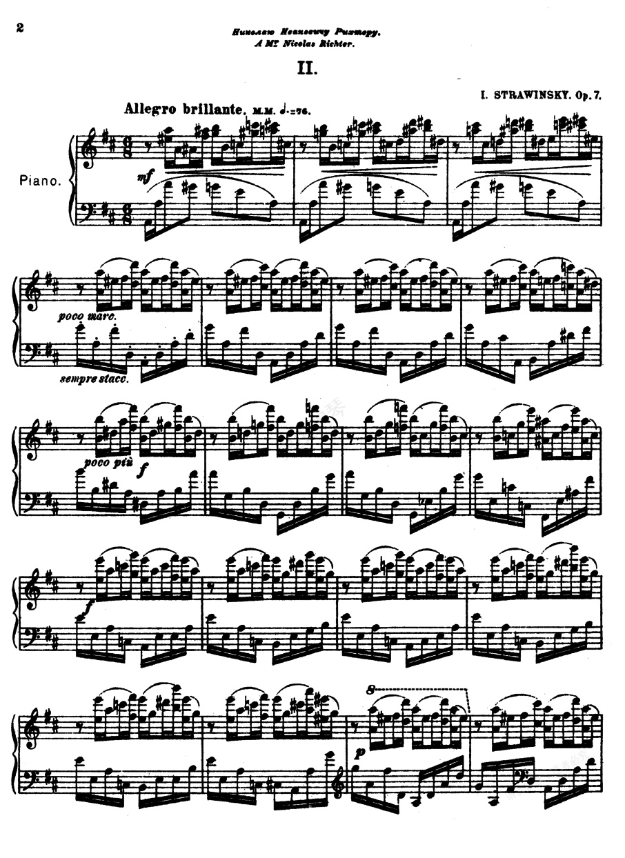 4首练习曲 4 Op.7《四首练习曲》Four Op.7 ,是斯特拉文斯基早期的创作之一,表现出对异乎寻常的乐器色彩、狂烈的节奏、严酷的力量与热情的偏爱。是近年来钢琴比赛中常用的作品。1. c小调,2/4拍,稍快的,五对三练习曲。2. D大调,6/8拍,华丽的快板,双音和八度练习曲。3. e小调,6/8拍,小行板,右手扩张及表情练习曲。4. 升F大调,4/4拍,活泼地,右手灵活及左手练习曲。