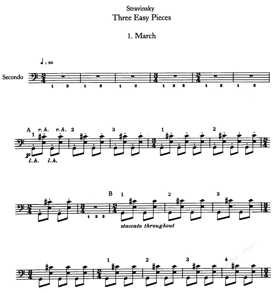 3首简易小品 Three Easy - 四手联弹《三首简易小品》Trois Pièces ,是斯特拉文斯基为自己的孩子而作的钢琴四手联弹作品,作于1914-1915年,也就是《春之祭》首演后不久。采用轻音乐风格写成,低音部分相对简单,几乎是固定的节奏型,高音部分则相对复杂。随后,斯特拉文斯基还将此部作品改编成其它乐器演奏或乐队演奏的形式。如于1915年将第一首“进行曲”改编成十二种乐器演奏的形式,将第二首“圆舞曲”改编成七种乐器演奏的形式,还将第三首“波尔卡”改编成扬琴独奏及扬琴与乐队演奏的形式。但最终出版的只有扬琴独奏版本的“波尔卡”。1921年,斯特拉文斯基还将这三首小品引用到他为小型乐队而作的《第二组曲》Suite No.2 中作为前三个乐章。1. 进行曲 March ,G大调,2/4拍,每分钟80拍的速度。2. 圆舞曲 Valse ,C大调,3/4拍,每分钟66小节的速度。3. 波尔卡 Polka ,降B大调,2/4拍,每分钟96拍的速度。
