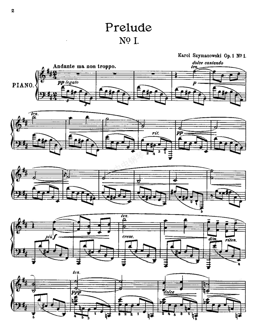 9首前奏曲 Nine Op.1《九首前奏曲》9 Op.1 ,作于1900年。当时年仅18岁的席曼诺夫斯基正受肖邦等人的影响,因此这部作品中可以看见肖邦、舒曼以及勃拉姆斯的浪漫主义印迹。1. b小调,2/4拍,不过分的行板。2. d小调,3/2拍,稍快的行板。3. 降D大调,3/4拍,小行板。4. 降b小调,稍快的小行板。右手6/8拍,左手却是2/4拍。5. d小调,3/4拍,激烈的甚快板。6. a小调,3/4拍,忧伤的慢板。7. c小调,4/4拍,中板。8. 降e小调,4/4拍,不太快的行板。9. 降b小调,4/4拍,忧伤的慢板。
