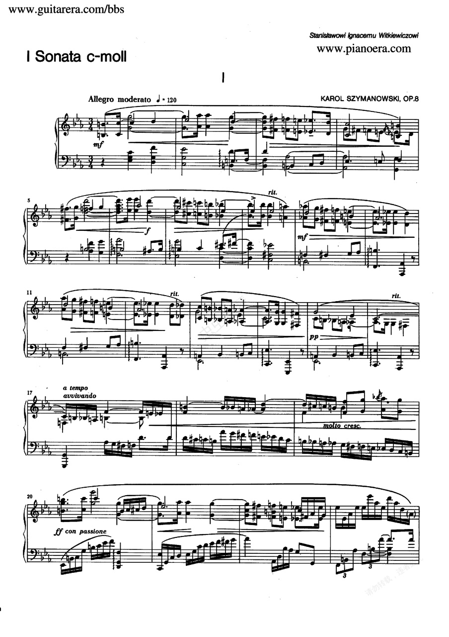 c小调第一钢琴奏鸣曲 Piano No.1 in c Minor Op.8《c小调第一钢琴奏鸣曲》Piano No.1 in c Minor Op.8 ,作于1903-1904年,题献给他的朋友,著名画家、剧作家和作家斯坦尼斯洛·维特凯维茨()。这是席曼诺夫斯基的第一部大型钢琴作品,当时他正师从作曲家齐格蒙特·诺斯科夫斯基()。作品中可见明显的肖邦风格,其中某些段落跟肖邦的《b小调第三钢琴奏鸣曲》Op.58 和《g小调大提琴奏鸣曲》Op.65 有着相似之处。1910年,在纪念肖邦诞辰一百周年的利沃夫(Lvov)作曲大赛中,这部作品荣获一等奖,并得到了众人的称赞。它共由四个乐章组成:第一乐章,中庸的快板,c小调,3/4拍。第二乐章,柔板,降A大调,3/4拍。第三乐章,小步舞曲速度,降E大调,3/4拍。中段为B大调,速度稍慢。第四乐章,终曲,c小调,4/4拍。引子为柔板-进行曲速度,随后进入三声部赋格的第一主题,有力的快板。第二主题转入g小调,稍慢的。经过发展后,再现赋格部分,最后进入C大调欢快的结尾,在高潮中结束。