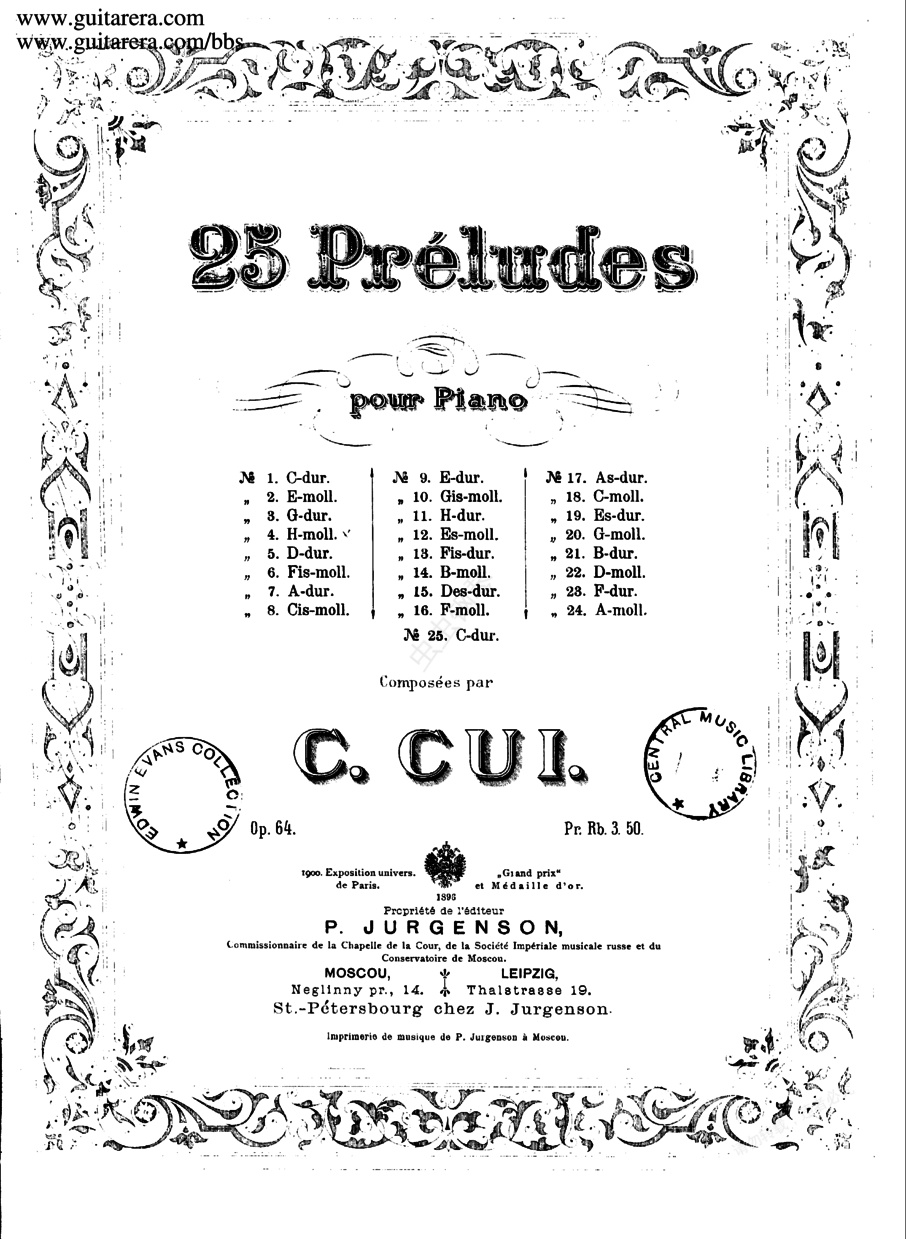 25首前奏曲 25 Op.64《二十五首前奏曲》25 Op.64 是居伊的钢琴代表作,也是居伊最大型的一部作品集,于1903年发表,跟拉赫玛尼诺夫的《前奏曲》Op.23 是同一时期的作品。其排列顺序与肖邦及斯克里亚宾的前奏曲不同,除第一首C大调外,第二首从e小调开始,按五度上行规律排列。大小调式并行,以小调优先出现。几乎都以三段式写成。1. C大调,庄重的快板,4/4拍。2. e小调,甚快的中板,4/4拍。3. G大调,快板,3/4拍。4. b小调,快板,6/8拍。5. D大调,小快板,9/8拍。6. 升f小调,行板,4/4拍。7. A大调,不过分的快板,4/4拍。8. 升c小调,快板,3/4拍。9. E大调,小行板,4/4拍。10. g小调,不过分的快板,6/8拍。11. B大调,小快板,4/4拍。12. 降e小调,小快板,3/4拍。13. 升F大调,行板,4/4拍。14. 降b小调,中板,5/4拍。15. 降D大调,小行板,7/8拍。16. f小调,小行板,4/4拍。17. 降A大调,小广板,3/2拍。18. c小调,小快板,6/8拍。19. 降E大调,小快板,2/4拍。20. f小调,不过分的快板,2/4拍。21. 降B大调,小快板,6/8拍。22. d小调,慢板,4/4拍。23. F大调,不过分的快板,3/4拍。24. a小调,中板,4/4拍。25. C大调,不过分的快板,3/4拍。